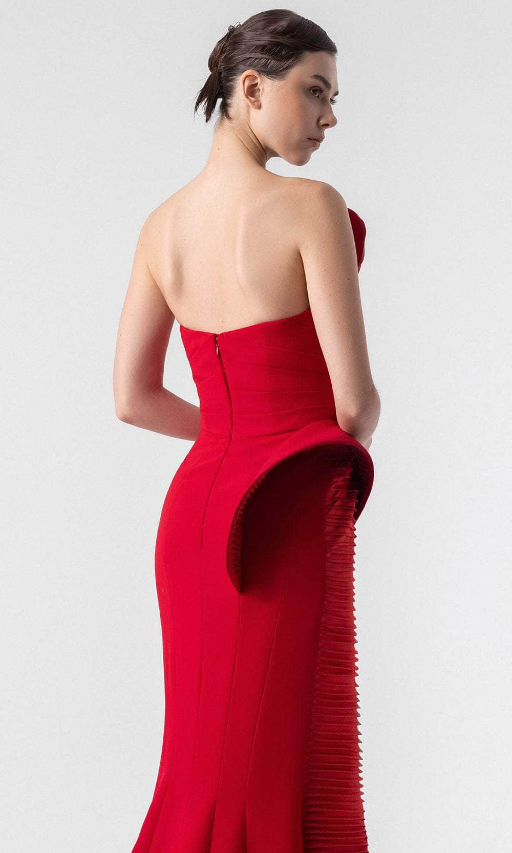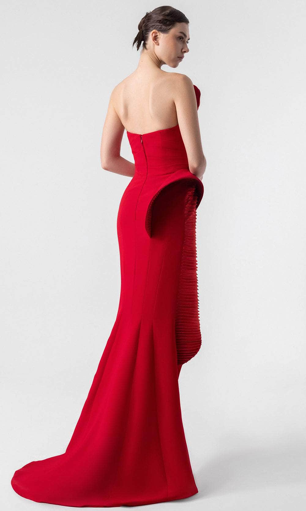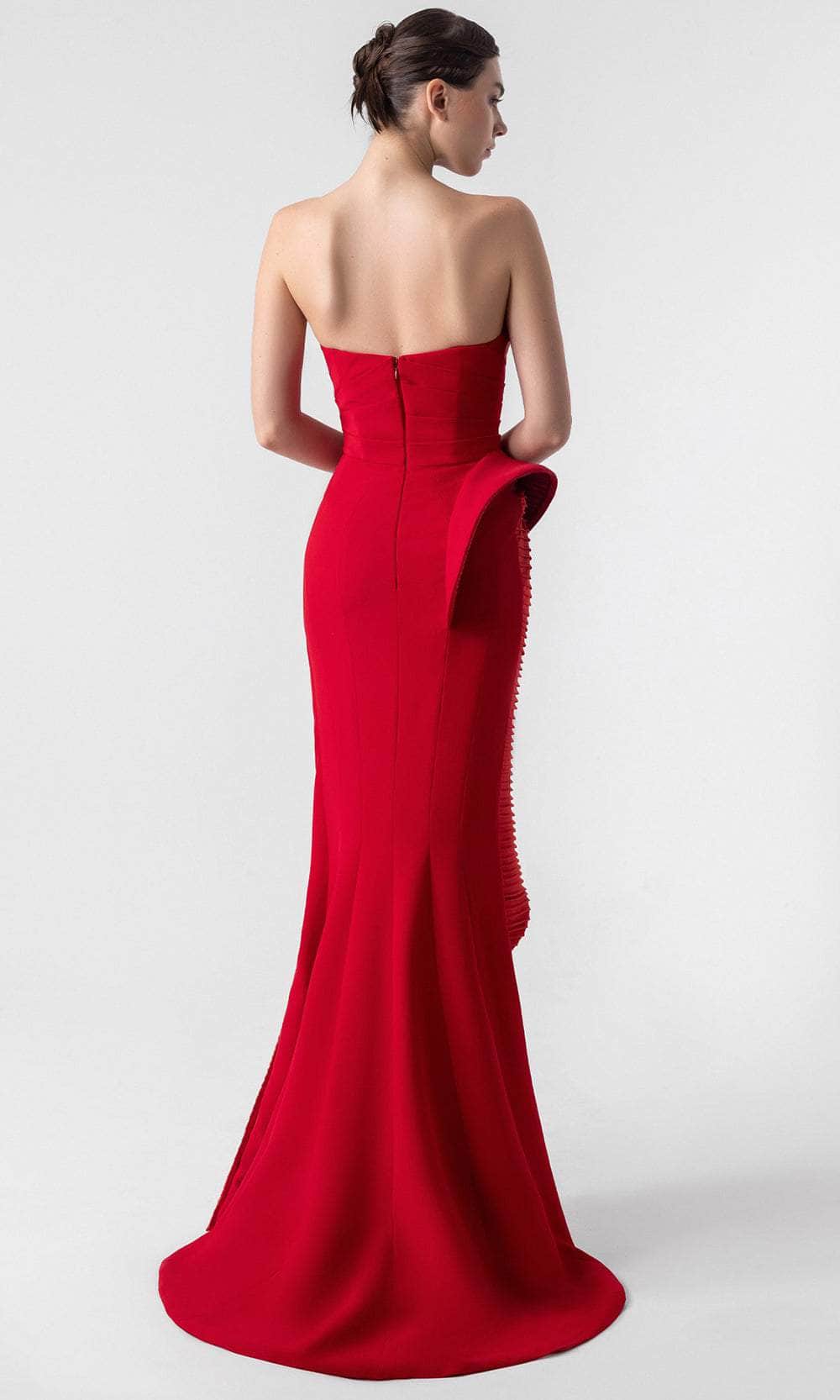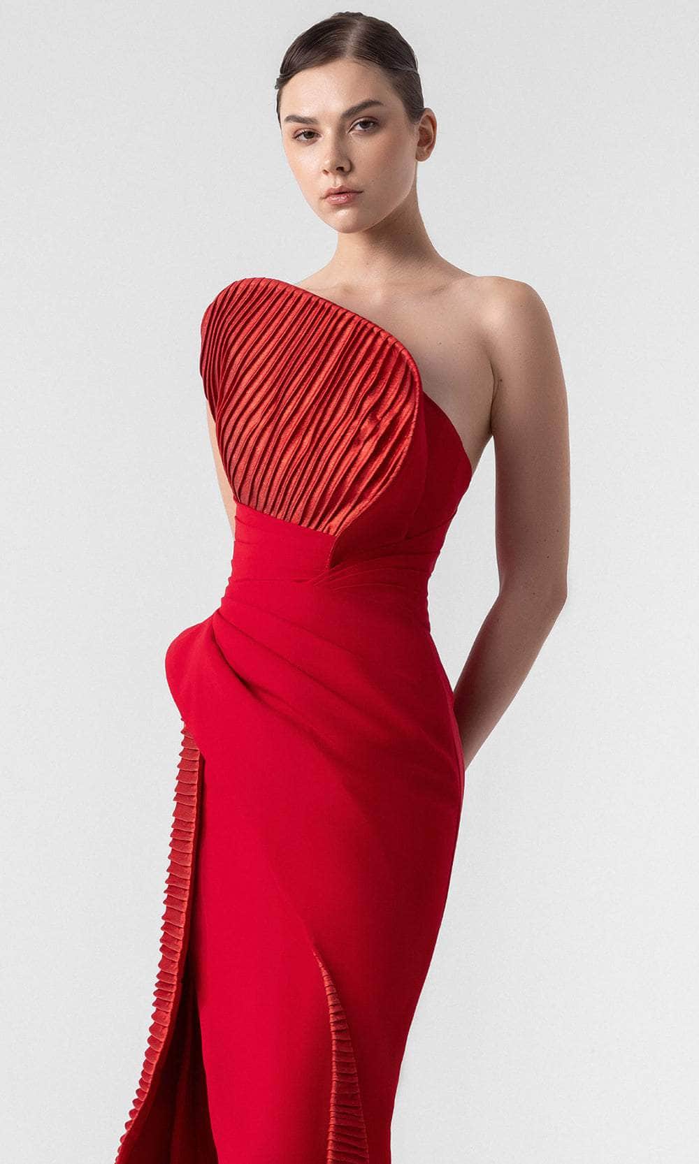 MNM Couture G1924 is a celebration of artistic tailoring and contemporary sophistication, designed to leave a lasting impression. This strapless gown showcases a unique pleated bodice that curves into an asymmetrical motif, complemented by contrast ribbed pleating along the skirt panel. The sheath silhouette creates a statuesque profile, while the high slit introduces an alluring element of surprise. Ideal for red carpet affairs or elegant evening celebrations, MNM Couture G1924 combines minimalist structure with avant-garde elegance for the modern woman. Model is wearing Red color.