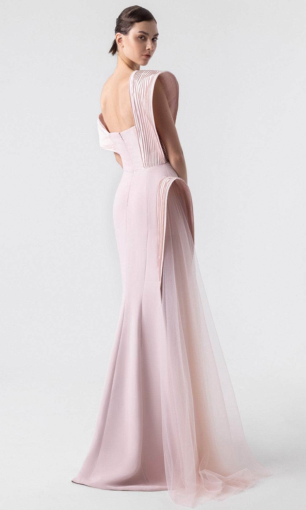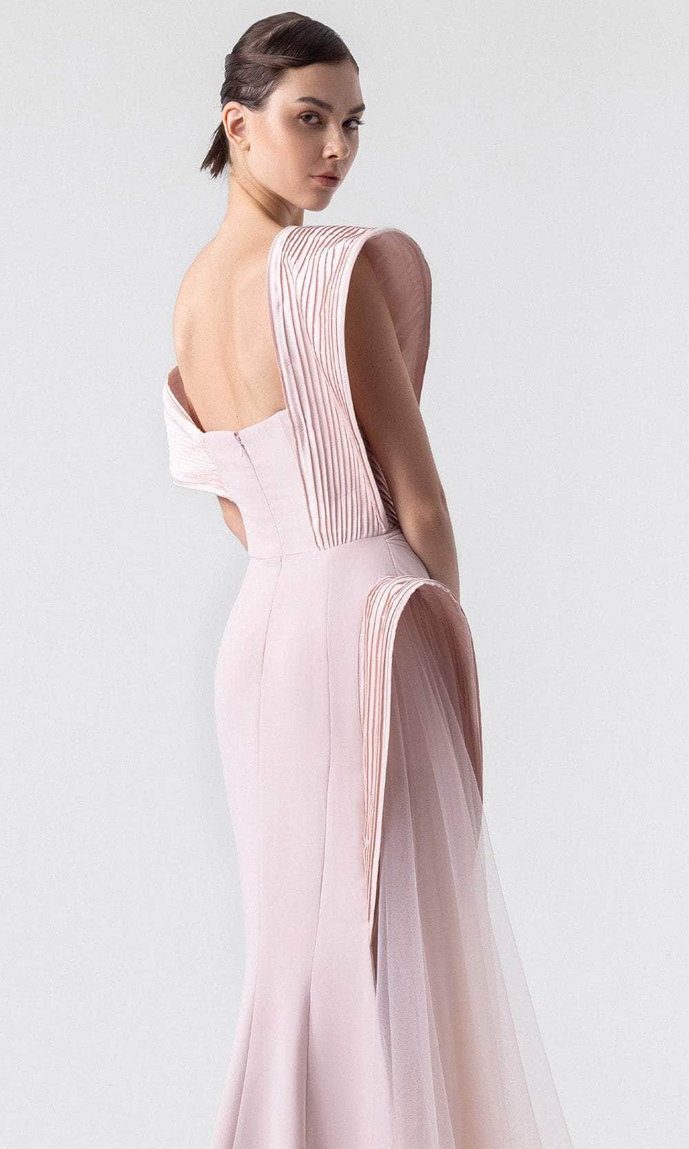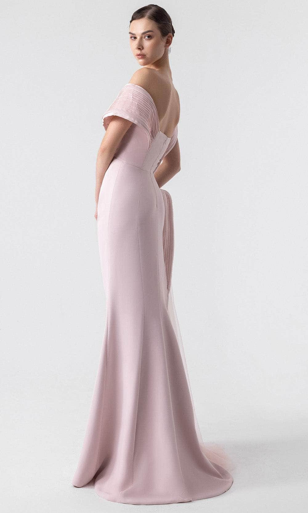 Sculptural finesse meets delicate detailing in the MNM Couture G1929, a gown designed to blend volume and line with masterful ease. The off-shoulder v-neckline is pleated to perfection, wrapping into a crisscross pattern that draws attention to the collarbones and shoulders. From the fitted bodice, a soft tulle overlay emerges, flowing to the floor and lending movement to the structured sheath silhouette. With a subtle slit and clean lines beneath the drape, this MNM Couture G1929 gown is perfect for formal occasions where elegance is matched by bold design. Model is wearing Pink color.