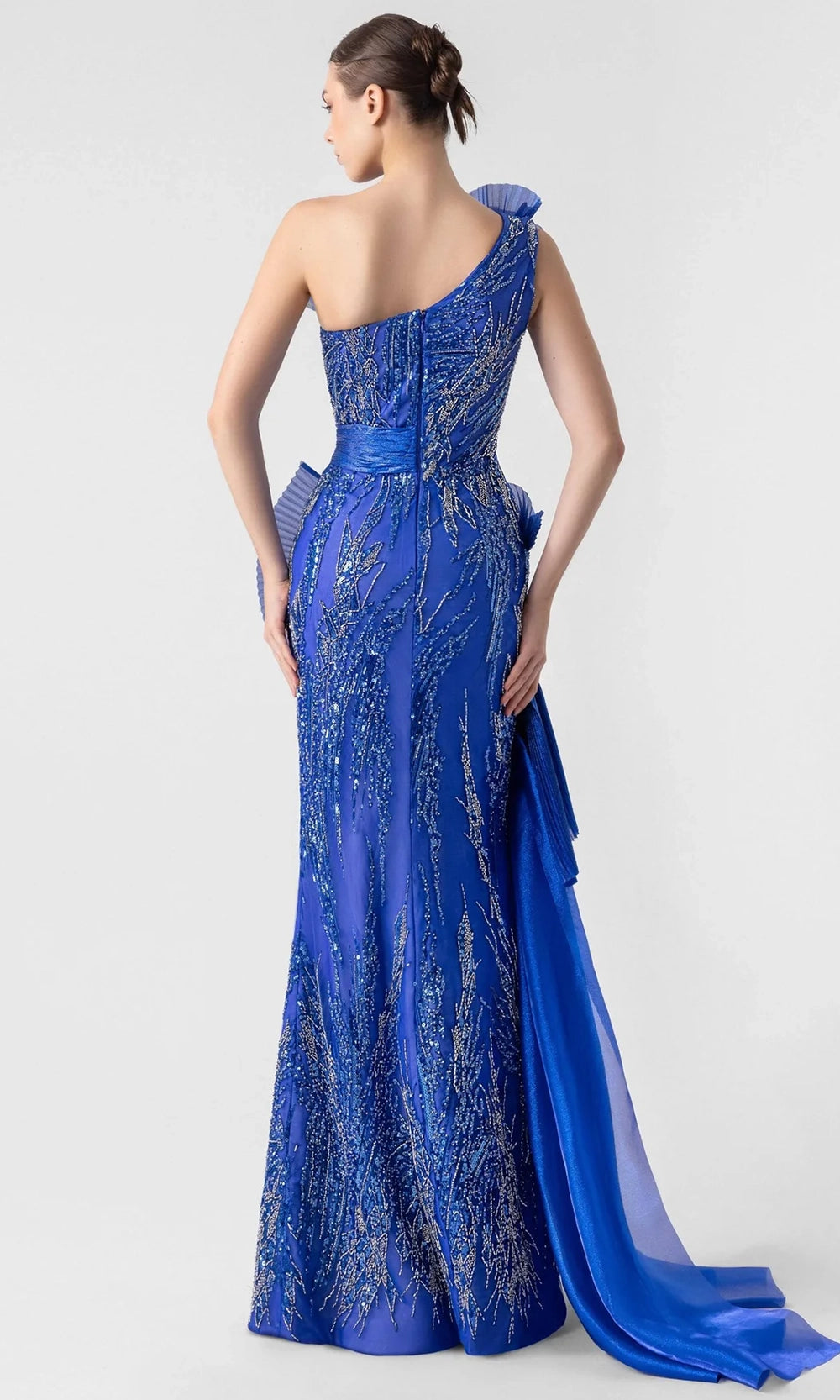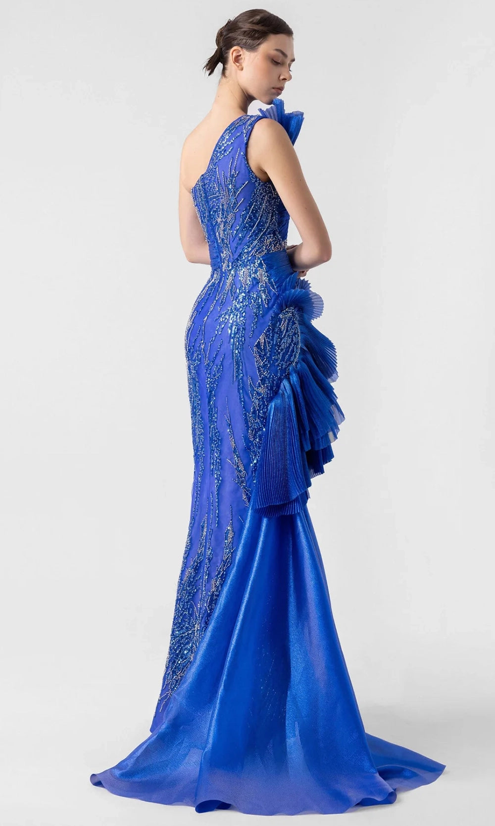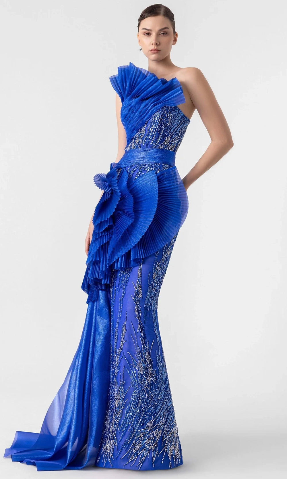 Embrace pure sophistication in the MNM Couture G1933, designed to leave every onlooker spellbound. A striking sleeveless gown is adorned with layered pleated ruffles that cascade from the bodice, delivering architectural beauty. The fitted sheath silhouette flatters the figure, while the beaded details shimmer under the lights. A thigh-high slit and asymmetric neckline adds allure, making this gown ideal for upscale galas or red-carpet moments. With MNM Couture G1933, you become the embodiment of bold couture glamour, leaving an indelible impression on every guest. Model is wearing Royal Blue color.