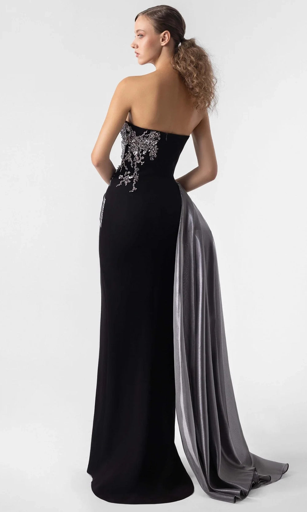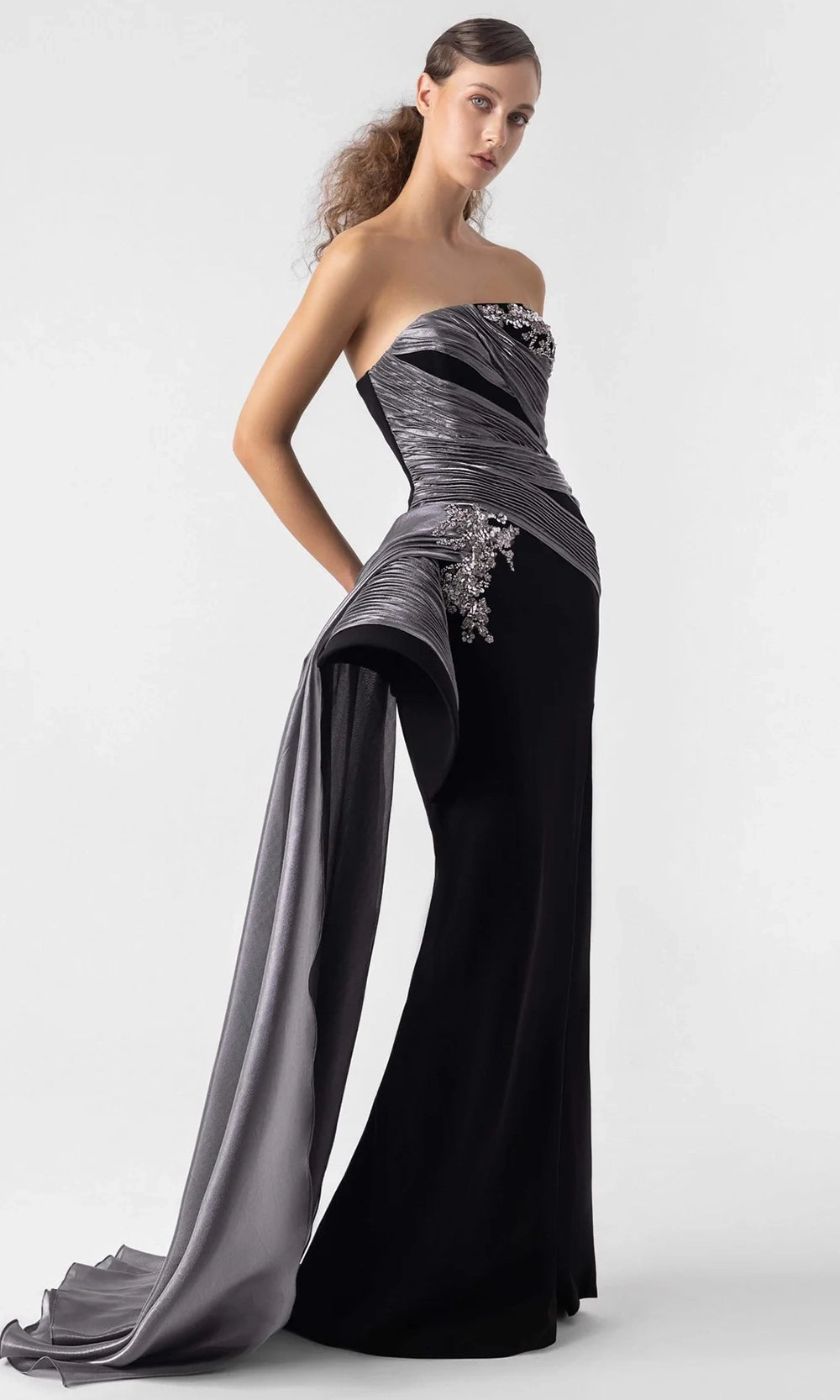 | Details: | Strapless, Pleated Bodice, Asymmetric Side Drape, Thigh-High Slit, Sweep Train, Crystal Beaded |