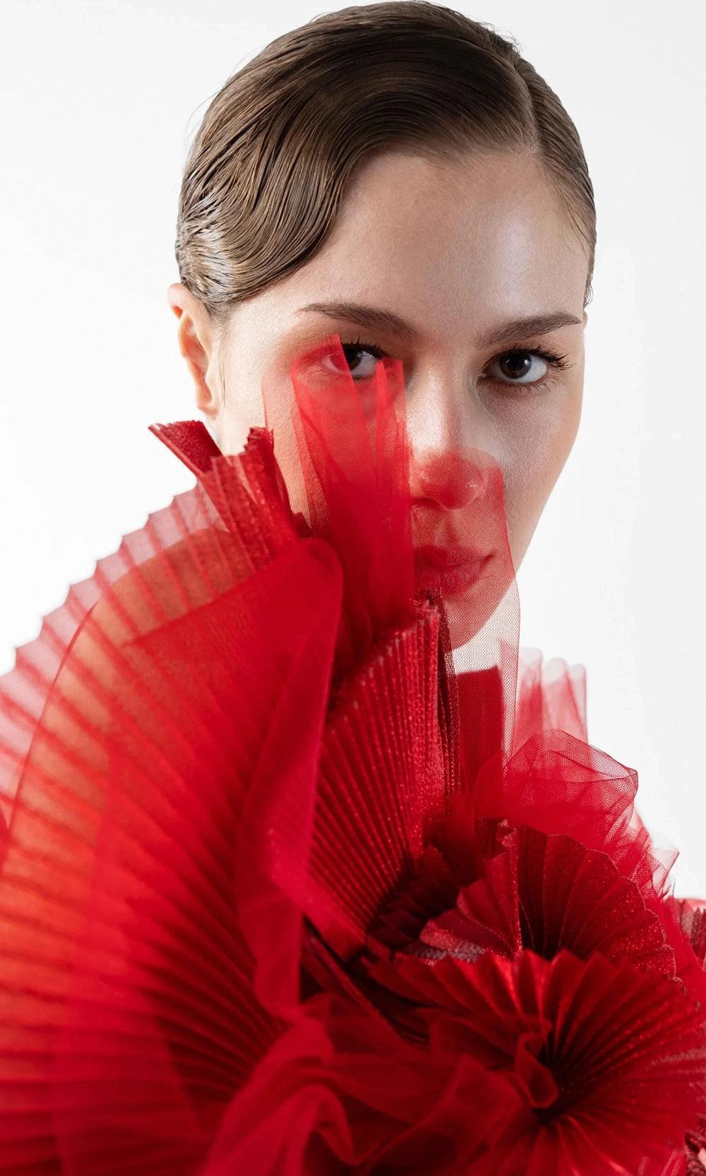 A vision of striking artistry unfolds with this MNM Couture G2001 sleeveless gown, where architectural elements meet fluid elegance. Soft pleated organza and draped tulle sweeps across the bust, forming a unique bateau neckline. The sheath silhouette skims gracefully over the figure, complemented by a side drape that extends into a subtle train. Every detail f this gown is thoughtfully placed to create an alluring balance between drama and refinement. From the innovative neckline to the floor-grazing finish, MNM Couture G2001 is an unforgettable statement of couture beauty. Model is wearing Red color.