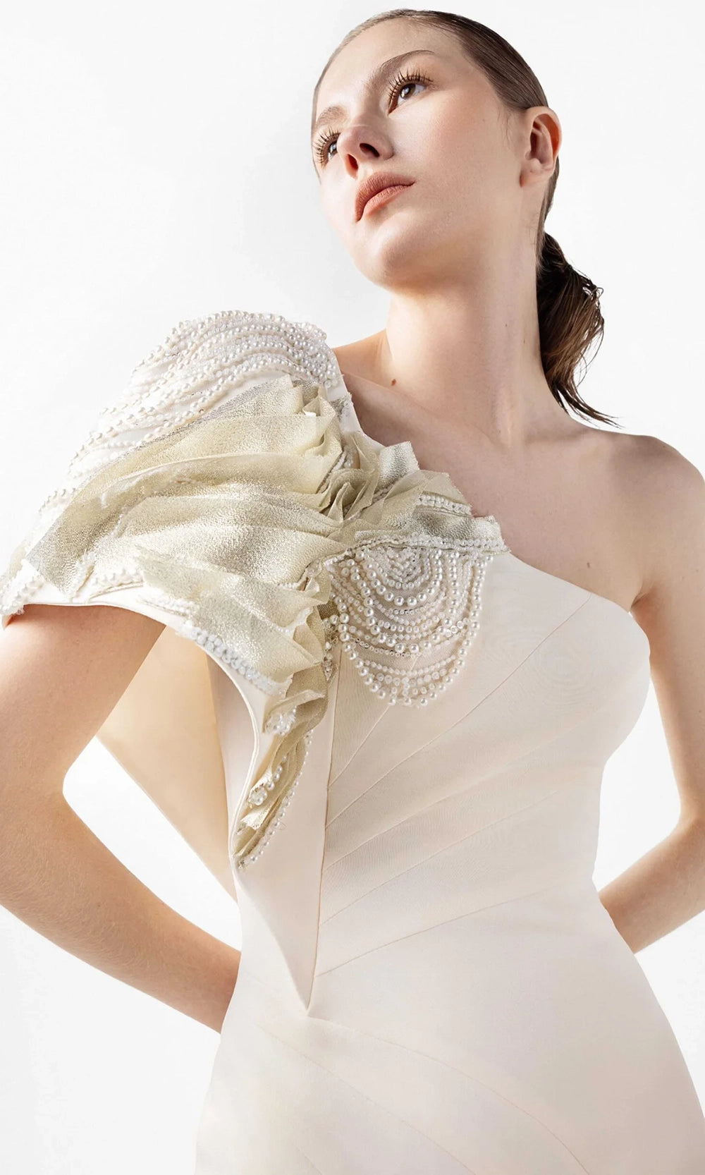 Elevate your presence and exude unmatched charm in this MNM Couture G2003 style. The gown introduces an asymmetric neckline that flows seamlessly into a soft drape cascading down one arm. Its mermaid form embraces the figure, subtly enhancing curves while maintaining a poised shape. One shoulder puff sleeve adorned with pearl embroidery and sculptural folds make this gown a refined option for elevated events. Make a confident statement with the MNM Couture G2003, where subtle detailing and a striking cut define the look. Model is wearing Cream color.