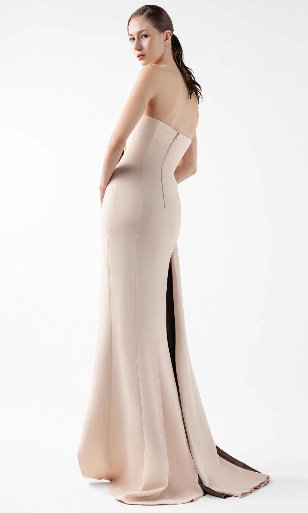 | Details: | Two Tone, Strapless, High Slit, Side Drape, Architectural Bodice Folds, Sweep Train |