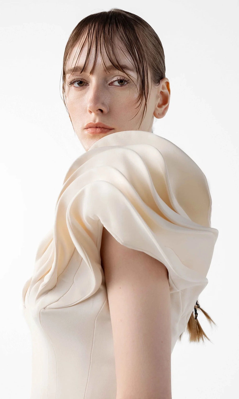 Architectural expression comes to life in this MNM Couture G2039 statement gown that turns structural volume into wearable art. The shoulder design, featuring tiered sculptural layers creates an impression of motion frozen in time. Its v-neckline and V-shaped back draws the gaze upward, enhancing posture and presence. Below, a precisely tailored bodice transitions into a smooth sheath skirt that adds subtle movement and grace. The balanced silhouette flatters while maintaining a bold visual edge. MNM Couture G2039 blends high-fashion influence with timeless evening sophistication. Model is wearing Cream color.