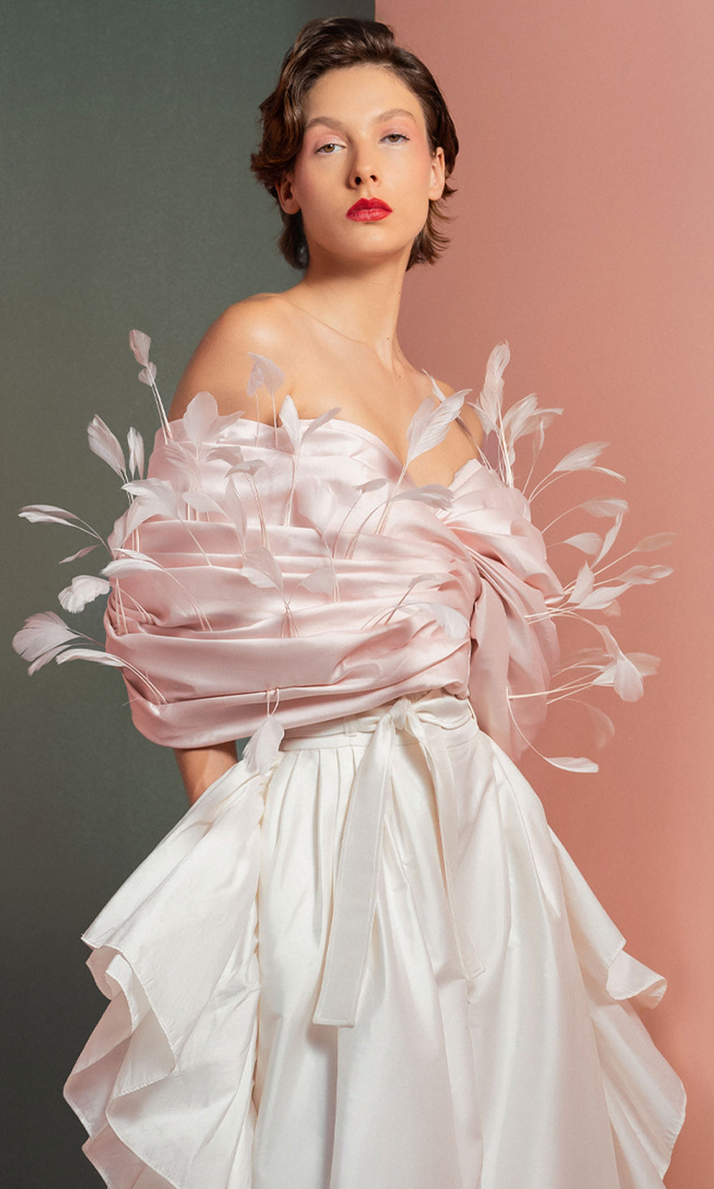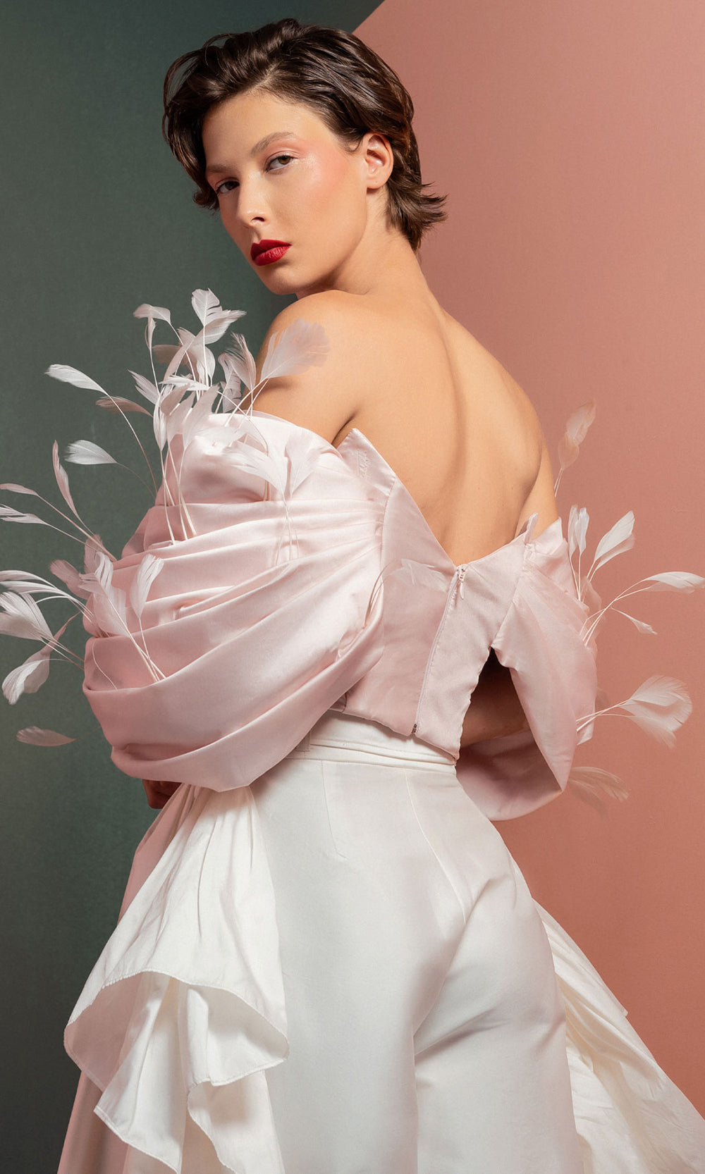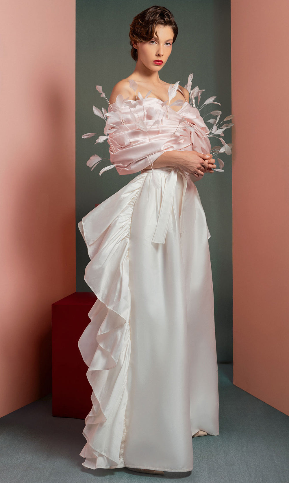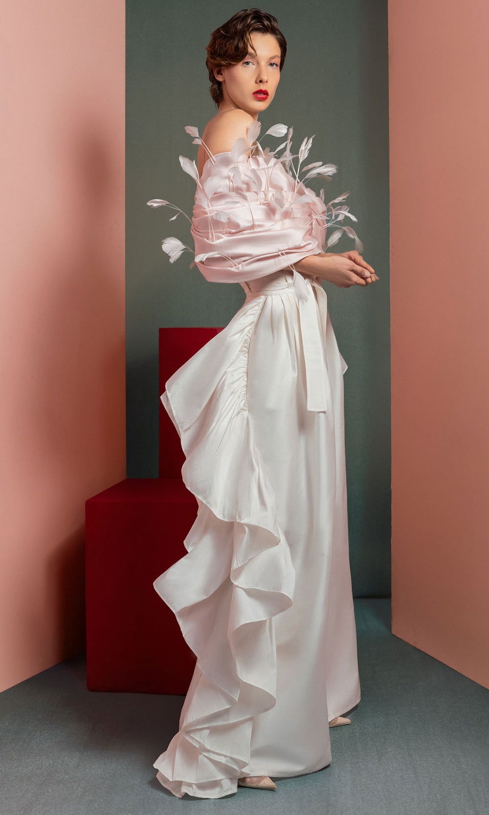 | Details: | Off Shoulder Sleeves, Feather Embellishments, Wide-Leg Pants, Side Ruffles, Tie Waist |