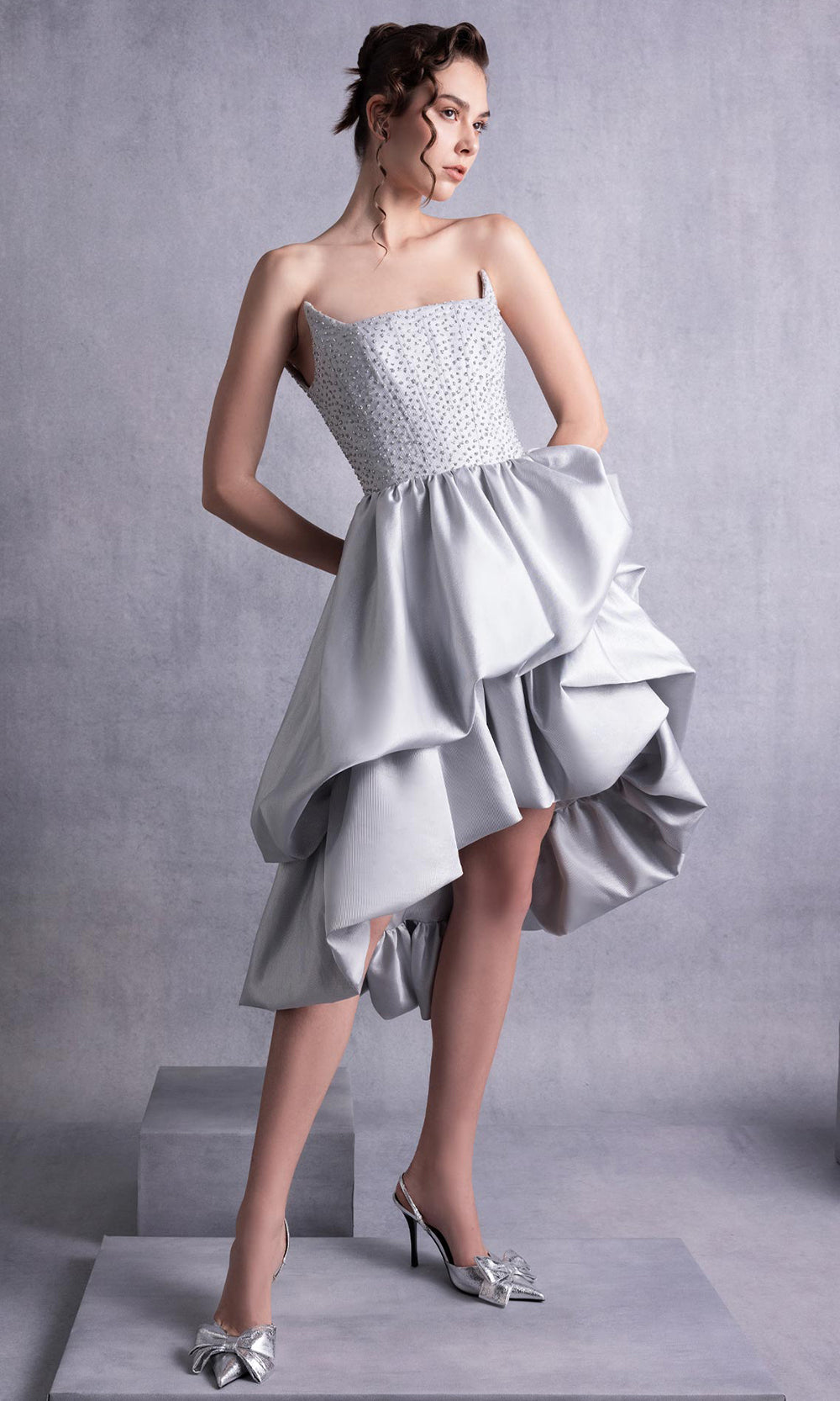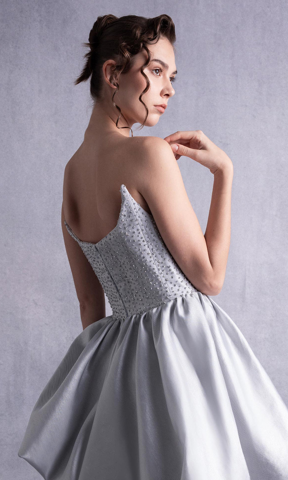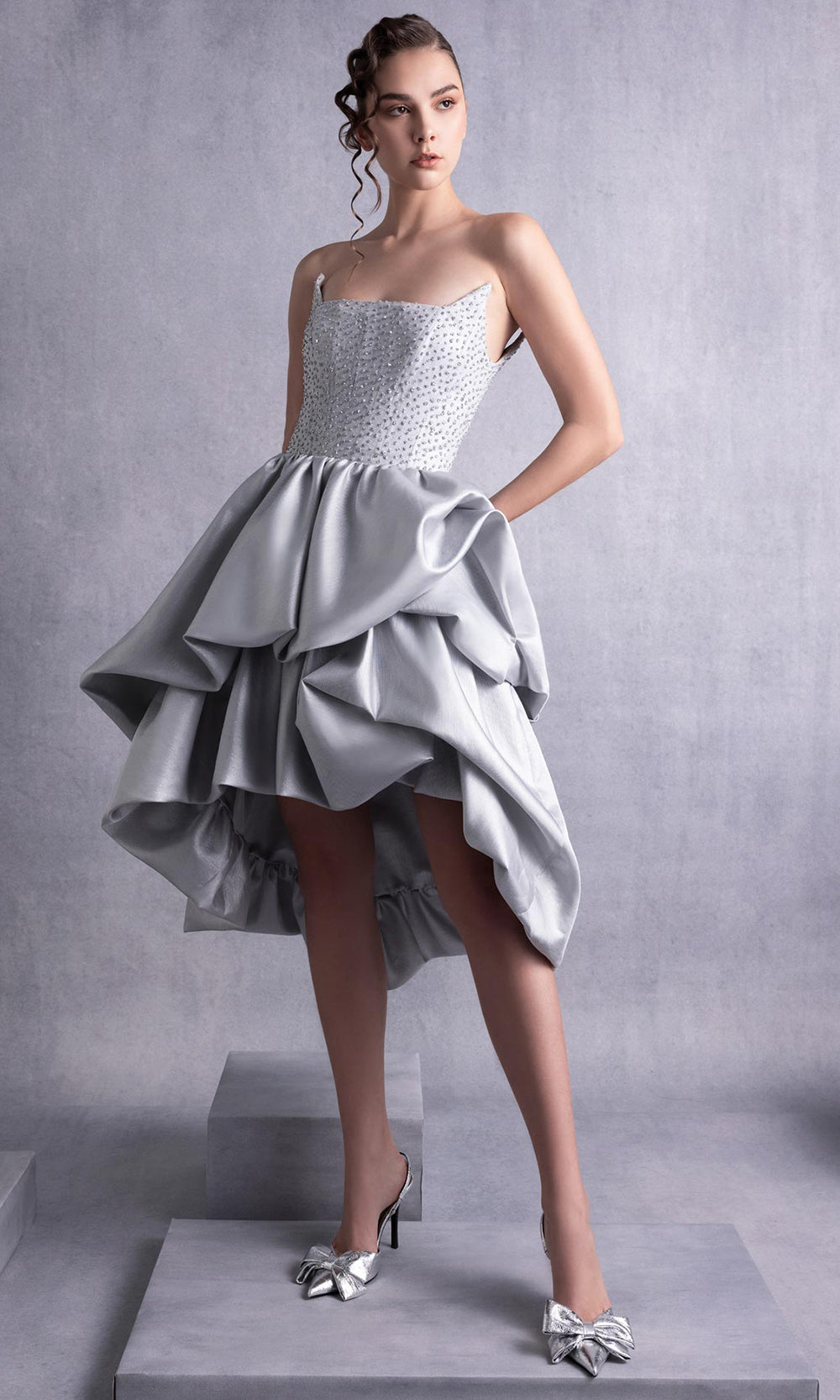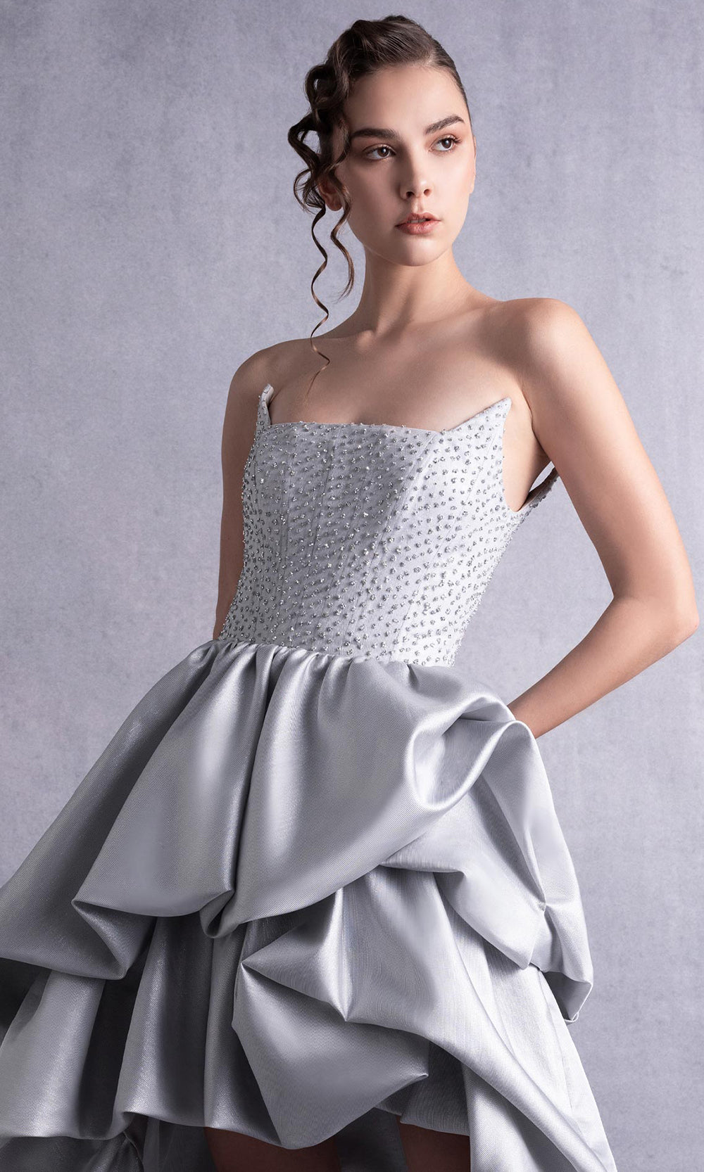 Delightfully dramatic, this MNM Couture GOS2538 dress combines intricate embellishment with bold ruffled layers to create a couture vision. The strapless scoop neckline is paired with delicate scoop back, leading into a fitted bodice adorned with radiant sparkle. From the waistline, a voluminous high-low A-line skirt of Mikado ruffles unfolds, creating texture, dimension, and fluid movement. MNM Couture GOS2538 is the embodiment of youthful glamour and high fashion, offering a statement look for those who wish to blend charm with elevated couture artistry. Model is wearing Silver color.