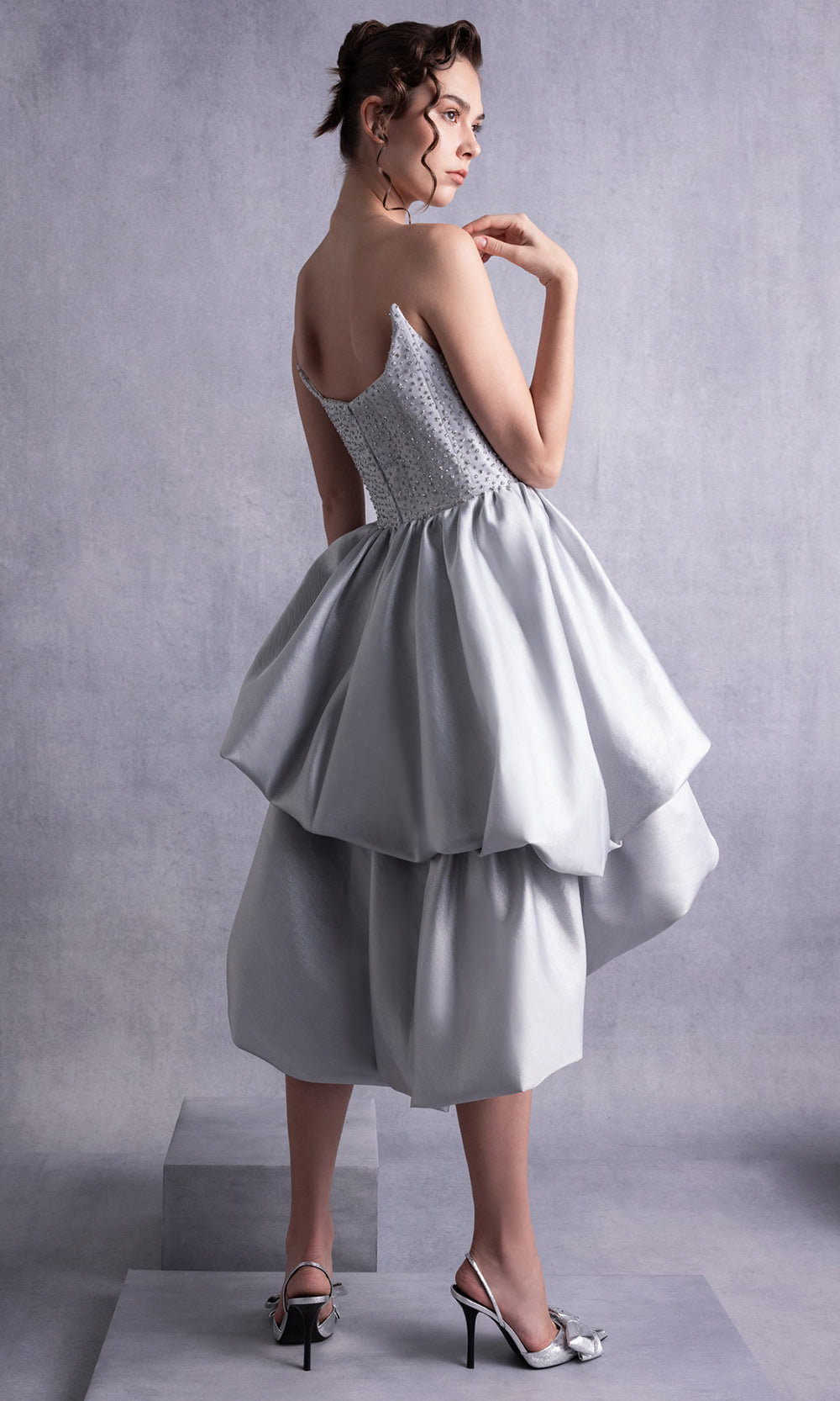 | Details: | Strapless, Scoop Back, Beaded Top, Dramatic Layered Ruffle Skirt, Bubble Hem |