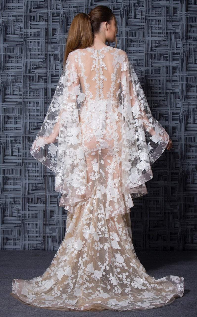 Take their breath away with this stunning look from MNM Couture K3619. This luxurious dress features a scalloped jewel neckline. The dress is designed with a high-low cape-like accent. The entire look is styled with embroidery down the full-length mermaid skirt with sweep train. The back has a zipper closure. This MNM Couture is sure to make you the darling of the party! Find more White Dresses for Women.