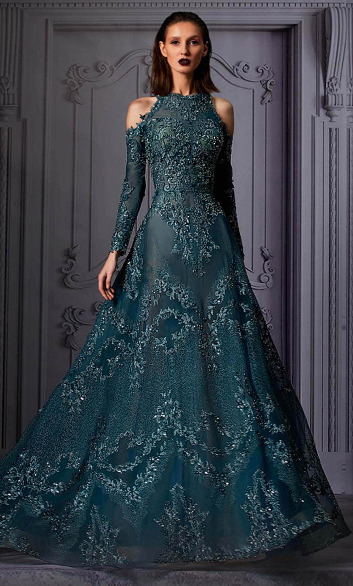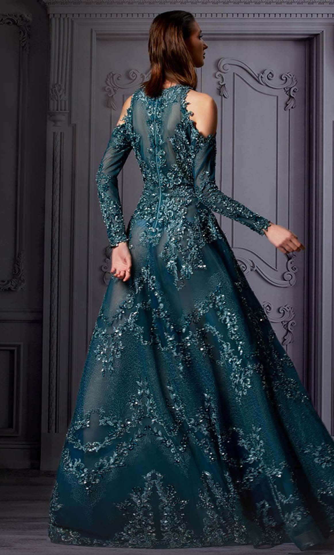 Leave them speechless in this MNM Couture K3856 masterpiece. Dare to express your alluring side in this fashionable dress that features a figure-flattering see-through silhouette, with a high neckline and back, adorned with exquisite embellishments. The cold shoulder style captivates and showing off some skin which is lovely, as the A-line skirt flows to a full length hem finish. Steal the show in this stunning masterpiece from the MNM Couture K3856 collection. Model is wearing the Green color.
