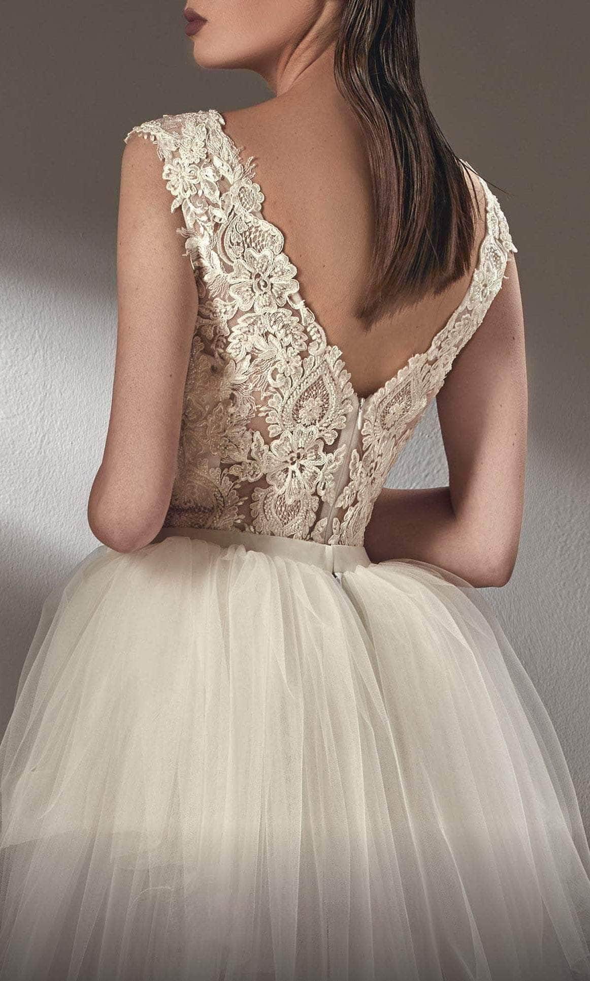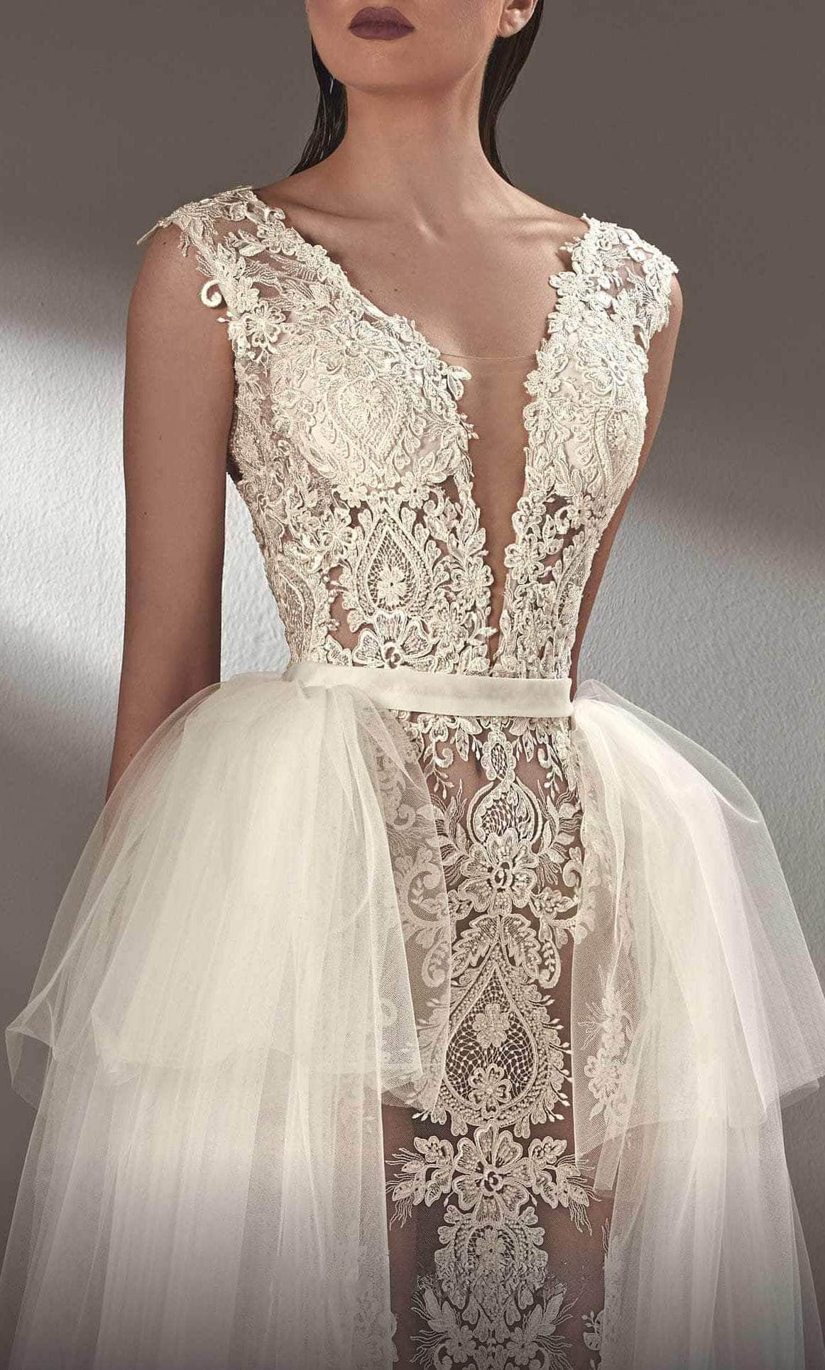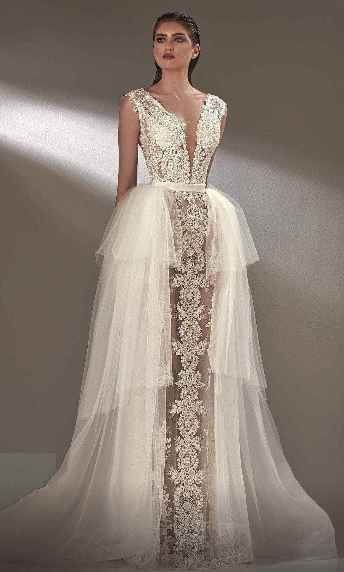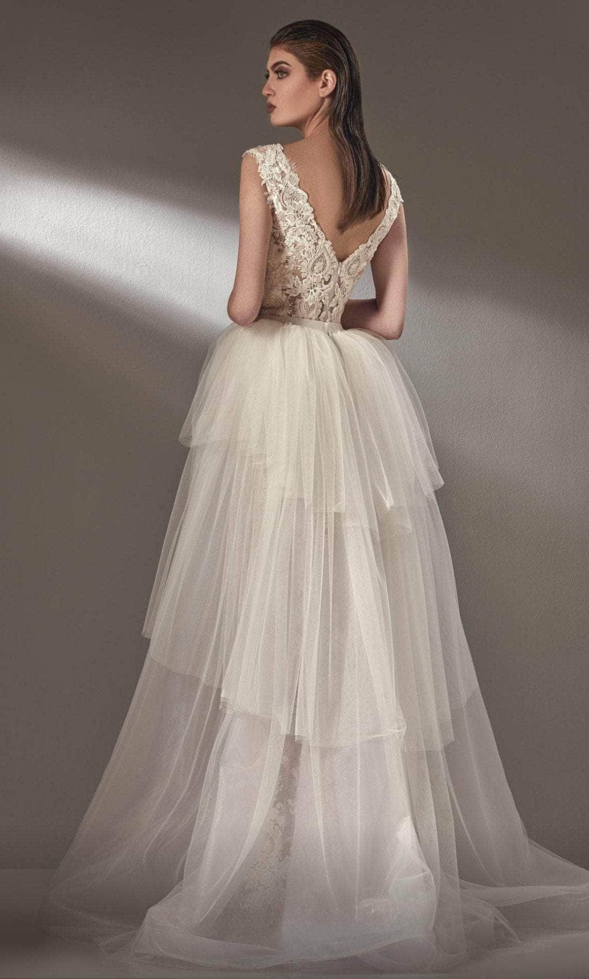 Exude a regal and timeless style on your wedding day in this MNM Couture K3905 creation. Tailored from beaded lace applique, this beauty features a sleeveless bodice with a deep V-neckline accentuated with a sheer inset. A removable second skirt made from layers of tulle makes this romantic gown versatile to cater to the needs of the most extravagant events. The sweeping train finish brings an elegant touch. Saunter on the red carpet and shine in this MNM Couture K3905 masterpiece. Model is wearing Off-White color.