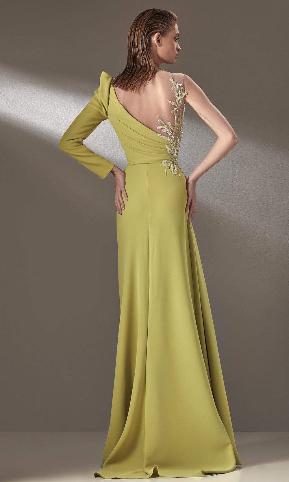 Flatter your figure with this MNM Couture K3908 evening dress. This dress fashions an illusion jewel neckline supported by a one shoulder long sleeve in a beaded and draped bodice. The skirt reveals an A-line silhouette while the back shows a full back to complete the look. Get glamorous look with this MNM Couture creation. Model is wearing Pistache color.