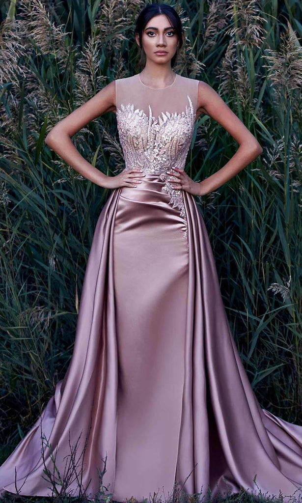 | Details: | Sheer Jewel Neckline, Embellished Sweetheart, Beaded, Sequined, Overskirt, Sheath, Back Zipper, Train |
