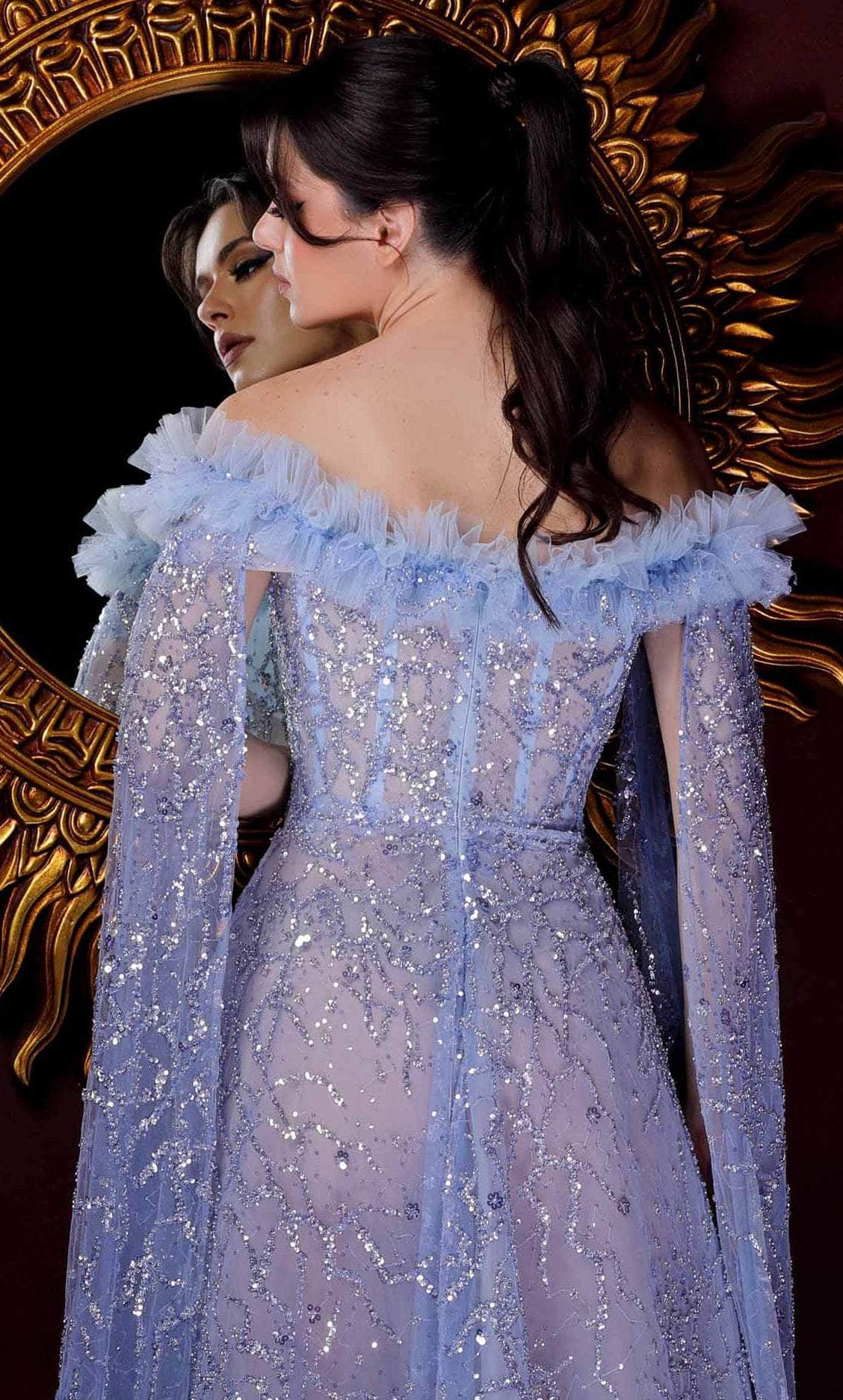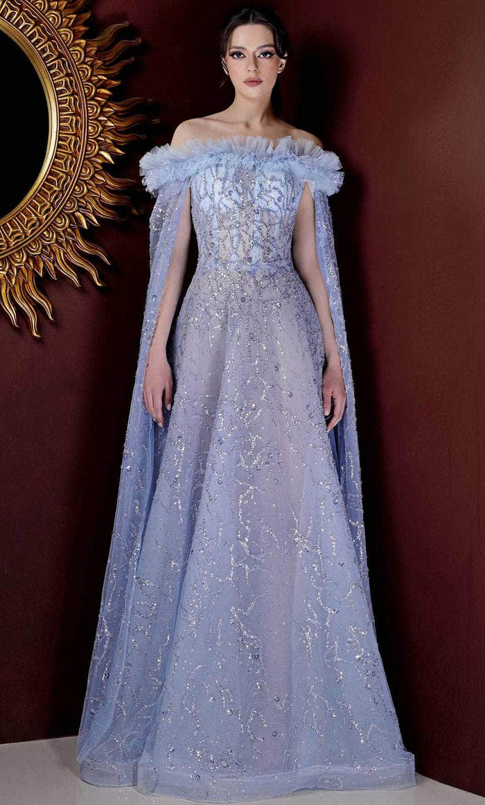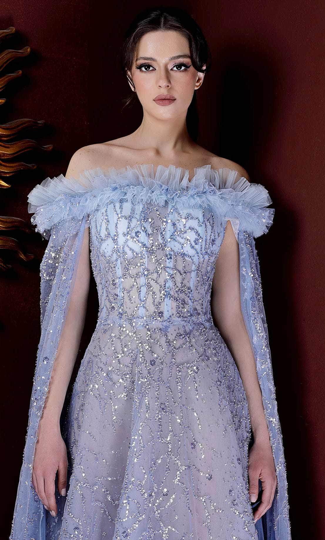 Be ready to fascinate everyone in this dress by MNM Couture K3993. Flaunt your figure in this see through dress and leave them speechless. Crafted from a delicate fabric with intricate beadworks throughout, featuring an off shoulder neckline and a mid-open back, with a zipper closure ensuring a perfect fit. Long shoulder capes and ruffled tulle accent add a touch of elegance as the A-line skirt cascades to a sweep train finish. Get ready to shine in this fabulous MNM Couture K3993 creation. Model is wearing the Light Blue color.