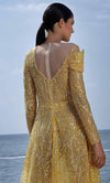 Capture the glamour as you walk on this stunningly gorgeous MNM Couture K4004. Featuring long sleeves and a stylish body details of cut outs and fall-off sleeves on one side. Showered with tiny sequins to make you glow and shiner through the night. The silhouette flows into a full length A-line shape and finishes with a horsehair hem with sweep train. This piece has a mesh skin tone inset. Make his gaze linger on you as you walk in this mesmerizing MNM Couture K4004 creation. Model is wearing Mustard color.