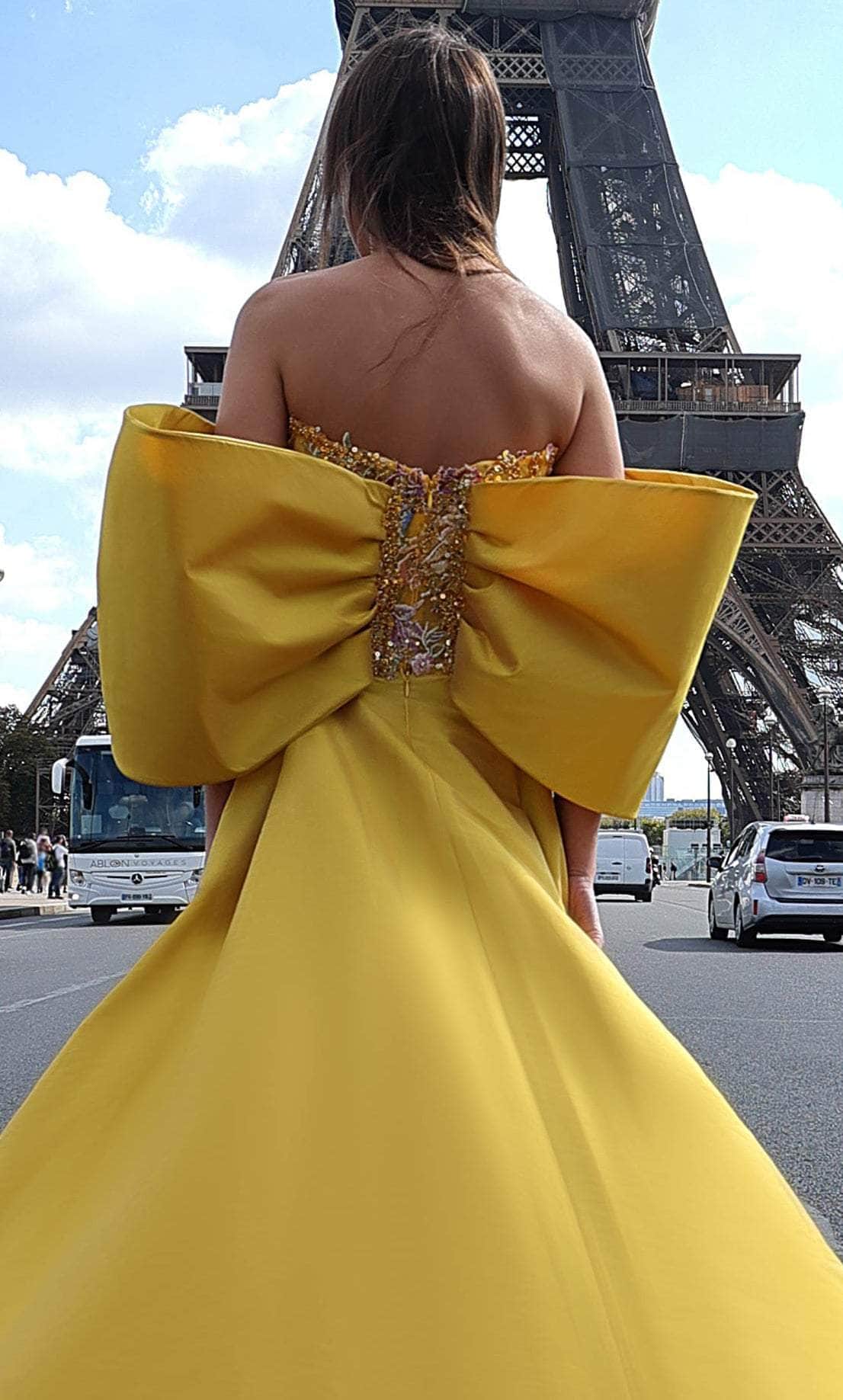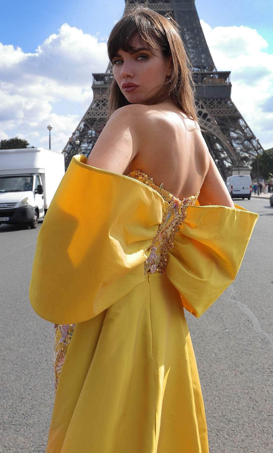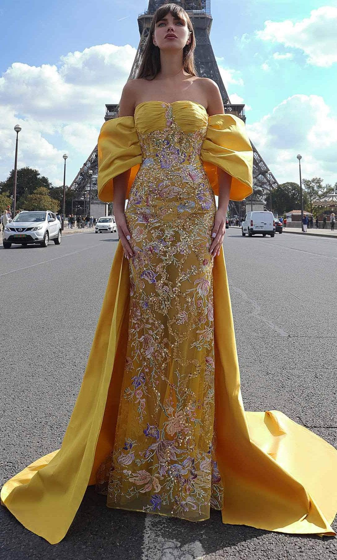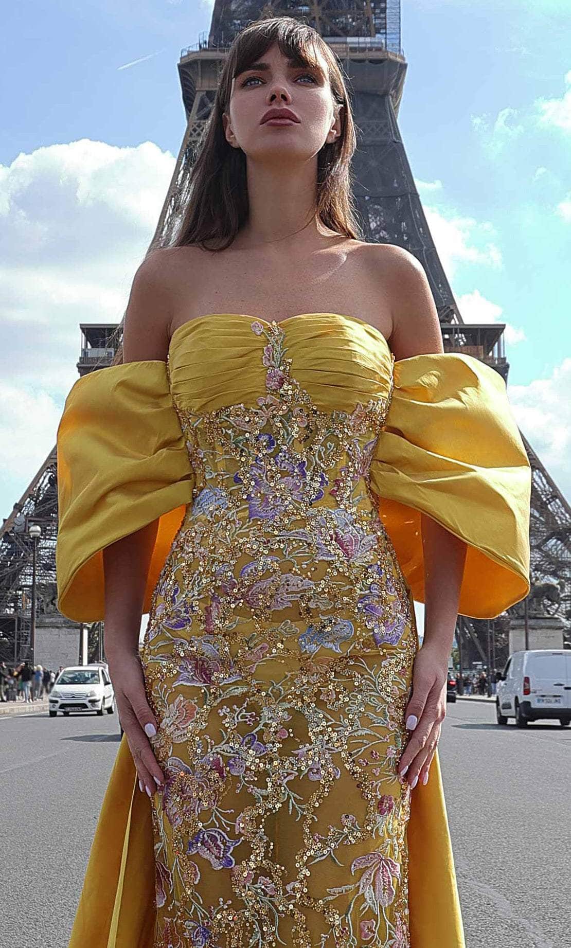 Glow with stunning elegance in this fabulous MNM Couture K4011 masterpiece. Embellishments of floral embroideries with sparkling sequins add a touch of elegance to the gorgeous piece, which features a strapless neckline, and is complemented by the pleated details. The back zipper ensures a snug, comfortable fit at the bodice. The skirt with an overskirt has a train and a sheath silhouette, making for a graceful exit. Make your dreams of sophisticated fashionistas come true with this MNM Couture K4011 gown. Model is wearing Yellow color.