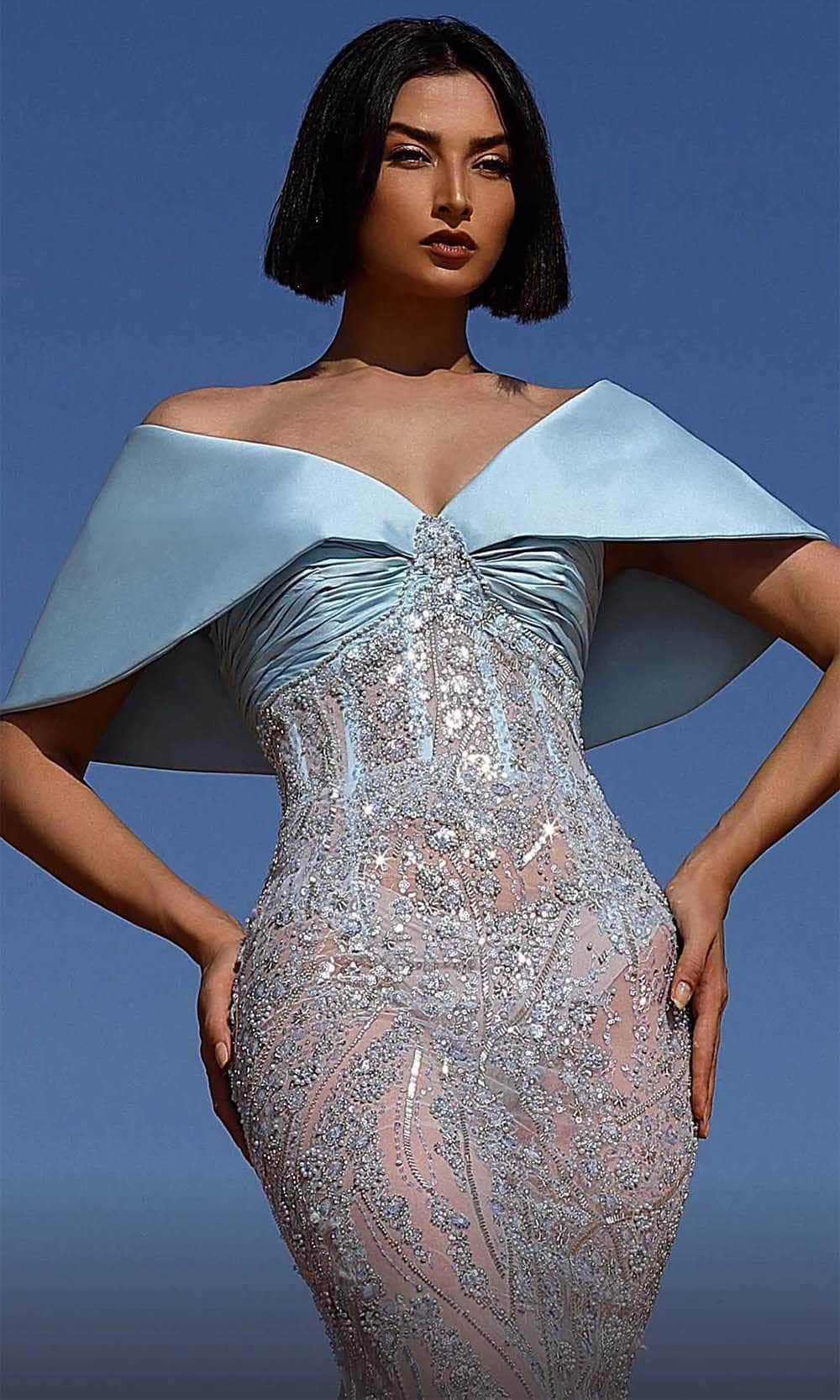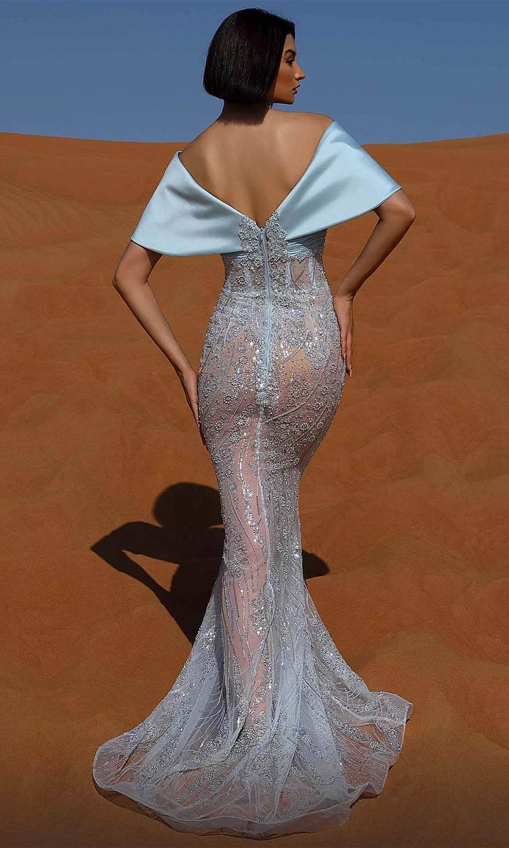Leave everyone in awe as you arrive adorned in this MNM Couture K4043 masterpiece. Adorned with intricate sculpting lines and embellished with delicate shimmering embellishments along the silhouette, this gown features an off-shoulder neckline paired with foldover cape sleeve. Designed shirring along the bust and crafted with a v-open back and a concealed zipper closure, the mermaid skirt showcases an illusion design, flowing into a sweeping train. Elevate your style with glamour in this magnificent MNM Couture K4043 creation.