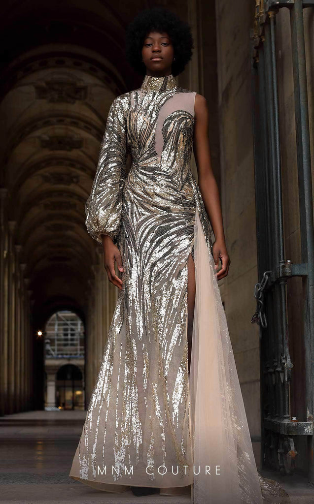 MNM Couture K4066 is an exquisitely crafted garment that exudes luxury and sophistication. This stunning piece is a sheer gown adorned with opulent sequins and intricate beading, creating an exquisite glamourous look. The bodice is cut with sheer detailing and an asymmetrical bishop sleeve and sleeveless design to flatter the figure. The mermaid skirt has an elegant high leg slit, offering a sensual yet classy look. Perfect for any formal occasion, this MNM Couture K4066 gown is sure to be a showstopper. Model is wearing the Gold Black color.