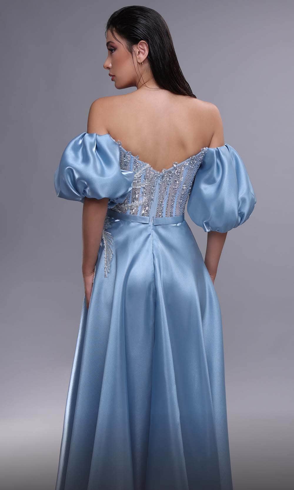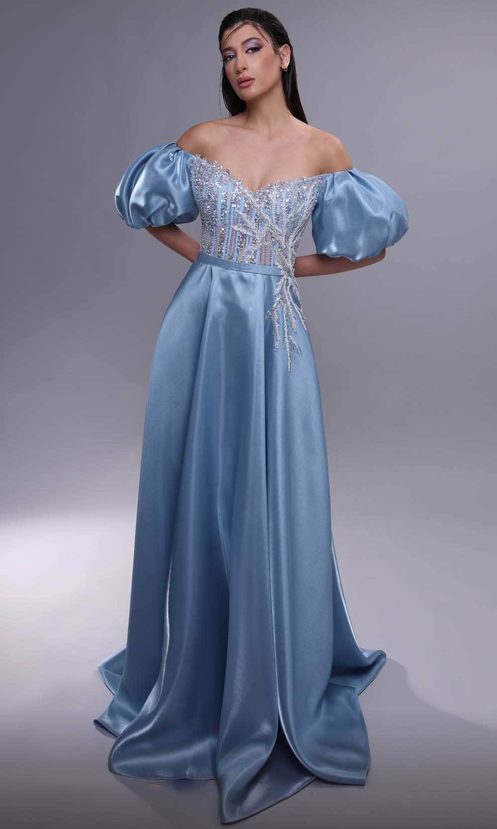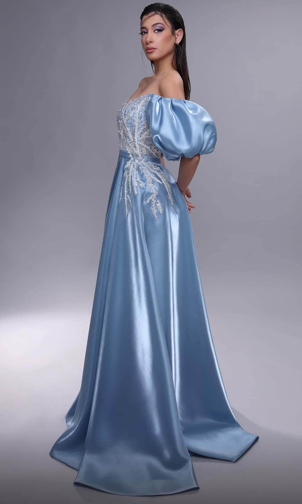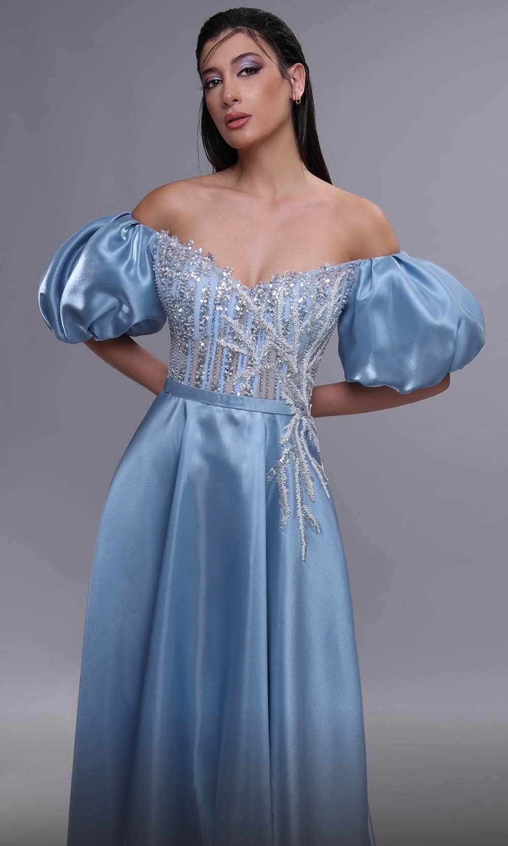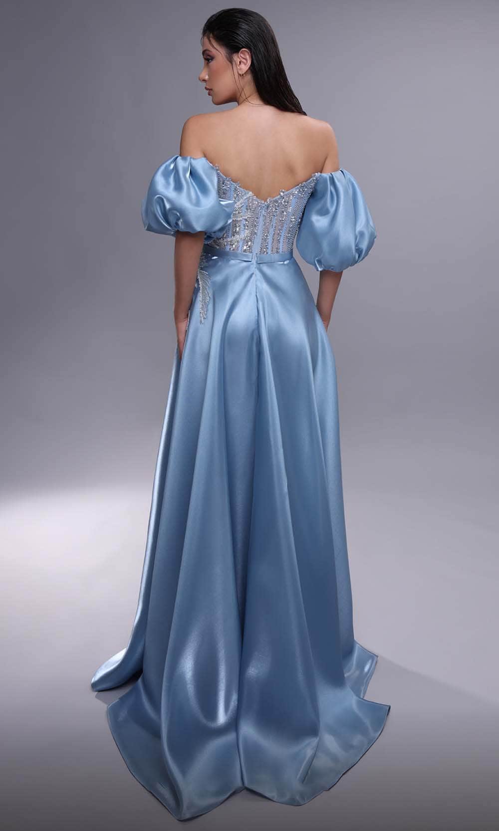 Embrace unparalleled luxury in the exquisite MNM Couture K4079 ensemble. This stunning attire is adorned with intricate beadwork and charming foliage embellishments, enhancing the female silhouette with meticulously crafted sculpting seams. Featuring a strapless bodice and a graceful off-shoulder neckline adorned with voluminous puff sleeves, the gown showcases a sheer bodice detailed with corset boning and a slim waistband. The gracefully open back, discreetly fastened with a concealed zipper closure, unveils an A-line skirt with a sweeping train. Effortlessly glide across the dance floor in the captivating MNM Couture K4079 ensemble.