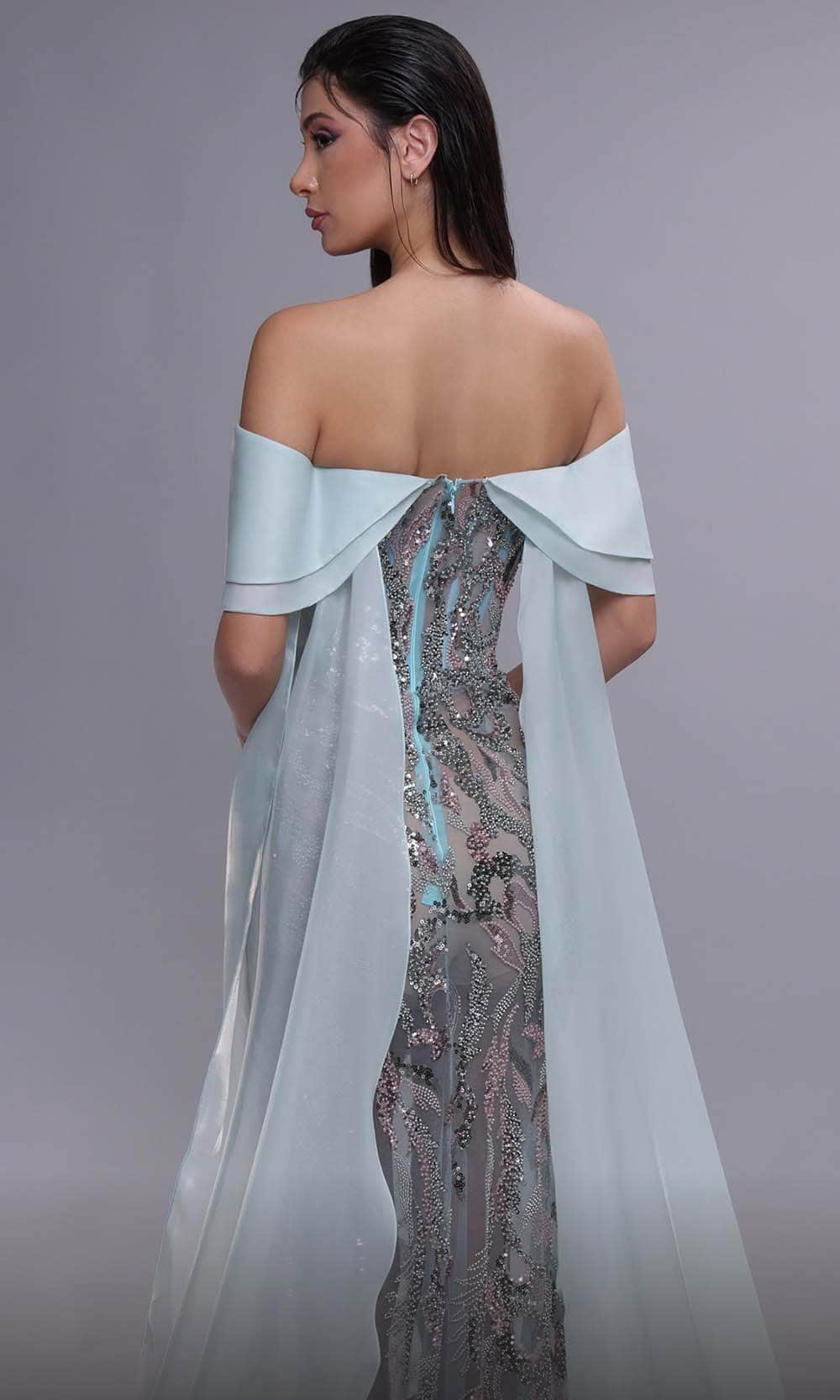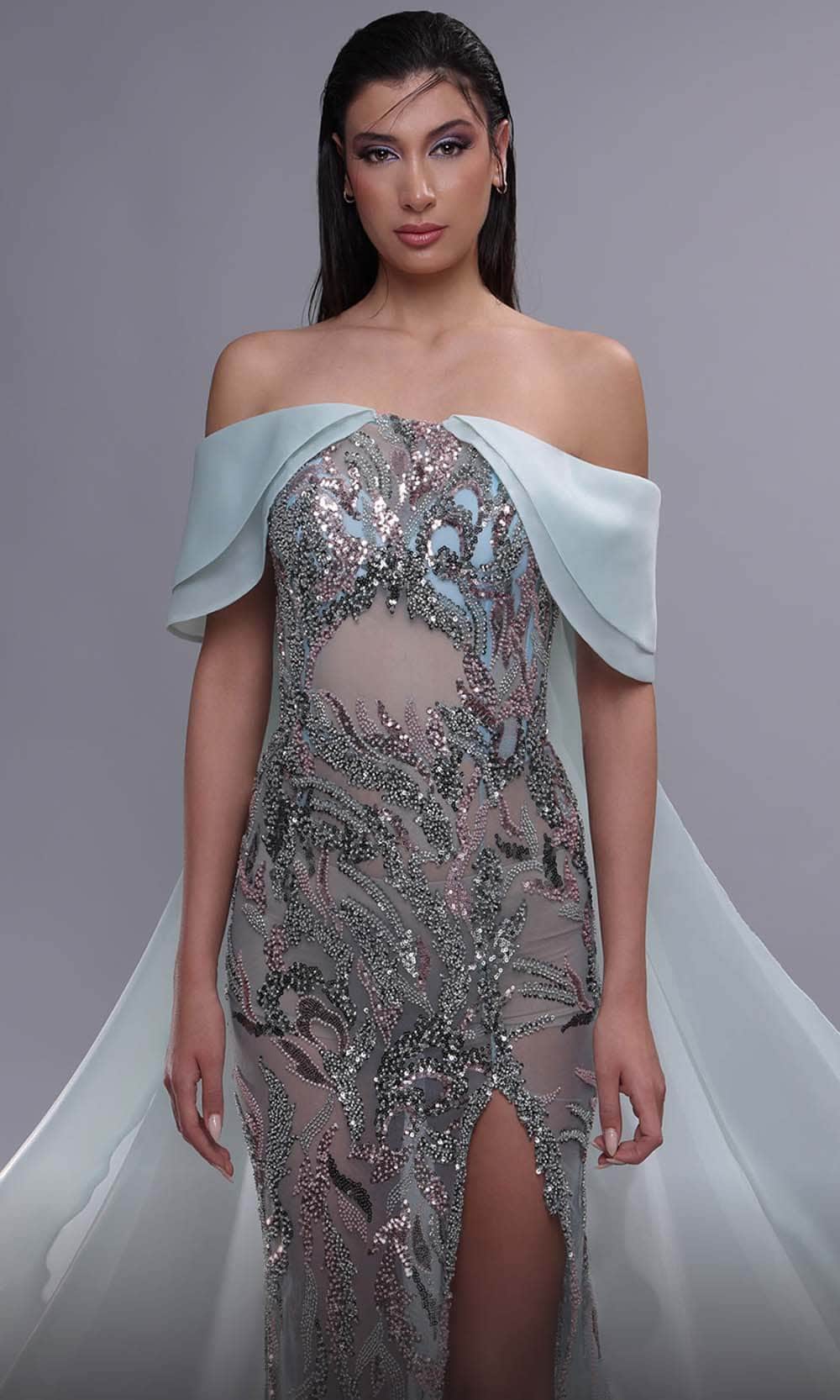 Flourish immaculate allure while wearing this MNM Couture K4092creation. This remarkable attire is embellished with intricate foliage-like beadwork and sheer panelled adornments, enriching the female silhouette with meticulously crafted sculpting seams. Featuring an off-shoulder neckline on the illusion cutout bodice, the gown presents foldover tiered sleeves. The beaded sheer back is discreetly secured with a concealed zipper closure as double panels cascade down the back. Revealing an alluring high slit, the sheath skirt with a sweeping train. Effortlessly glide across the dance floor in the captivating MNM Couture K4092 ensemble.