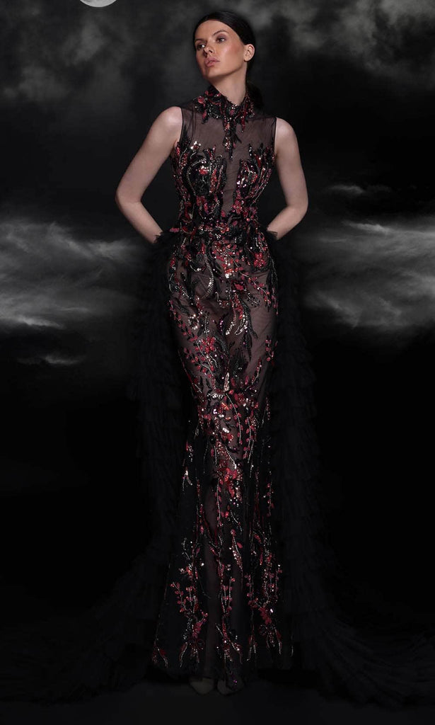 Channel red carpet charm wearing this MNM Couture K4099 masterpiece. The sleeveless gown has a see-through bodice that is decorated with sparkling beadwork and sequins, creating a fascinating look that will take everyone's breath away. It consists of a high neckline and full back with zipper closure at the center. The ruffled tiers on the A-line overskirt add a playful touch of femininity, with a sweep train from behind that adds a touch of drama. As it cascades down to the full length hem, the sheath skirt enhances your curves. Take your seat on the throne in a queenly gown from MNM Couture K4099. Model is wearing the Black color.
