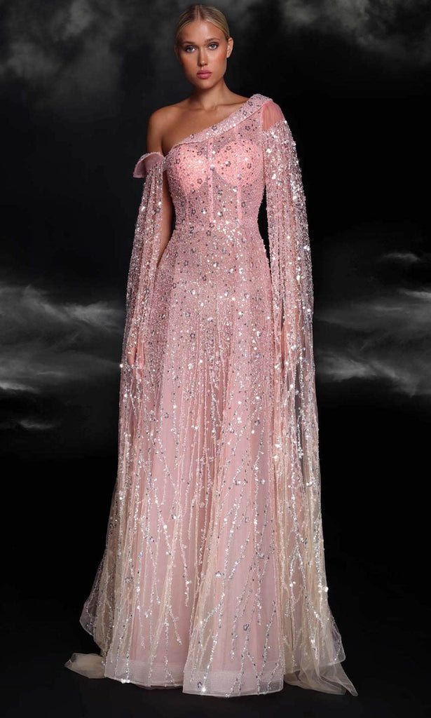 Flatter your finest assets as you enthrall the crowd in this creation by MNM Couture K4107. This design features hand-beaded sequins and bead embellishments all over the illusion bodice, creating a radiant and astounding impression. The asymmetrical neckline has alluring folded details, paired with a slanted mid-open back. A floor-sweeping cape sleeve gracefully frames your arms and emanates majesty. The A-line skirt flows to the full-length hem and is finished with horsehair edging. Be in the spotlight wearing this extravagant MNM Couture K4107 masterpiece. Model is wearing the Salmon color.