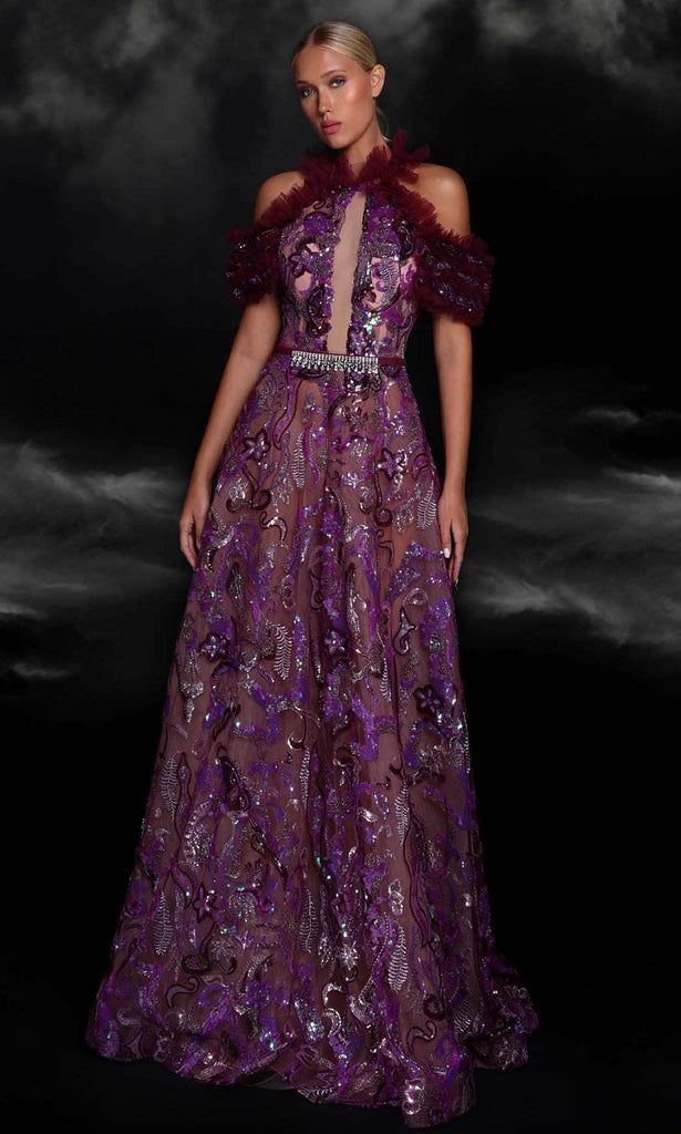Start your night out right with a fashionable creation from MNM COUTURE K4122. The gown is opulently embellished with a combination of beads, sequins, and embroidery, guaranteeing you effortlessly take the spotlight. With a dramatic ruffled trimmed, the top bodice consists of a high halter neckline, full back and short sleeves with a sultry cold shoulder design. The thin band embellished with crystal beads elegantly cinches your waist, giving you a striking slim appearance. The full length skirt flares an A-line silhouette and finishes with an elegant sweep train. This evening gown by MNM Couture K4122 is a red carpet knockout! Model is wearing the Purple color.