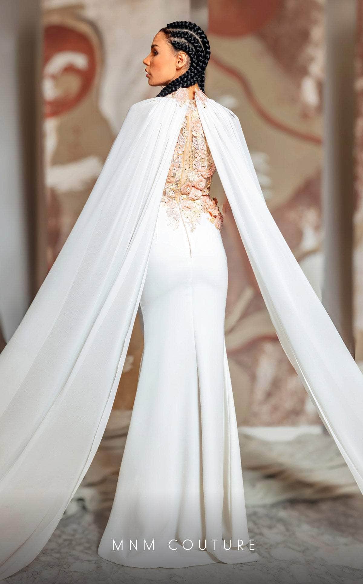 Bring in a style that is stunningly ethereal in this MNM Couture K4145 creation. Graced with a spectacle of blossoms and beadwork navigating the sheer bodice, this stylish piece reveals an illusion high neckline while flaunting a sheer overlaid cutout. Flourishing cape sleeves and a split full back with a concealed zipper closure, from the curves of the hips to the billowing train, this mermaid skirt is a symphony of grace and grandeur. Unveil your inner goddess in our opulent MNM Couture K4145 gown, a stunning testament to refined taste and opulent style. Model is wearing the White color.