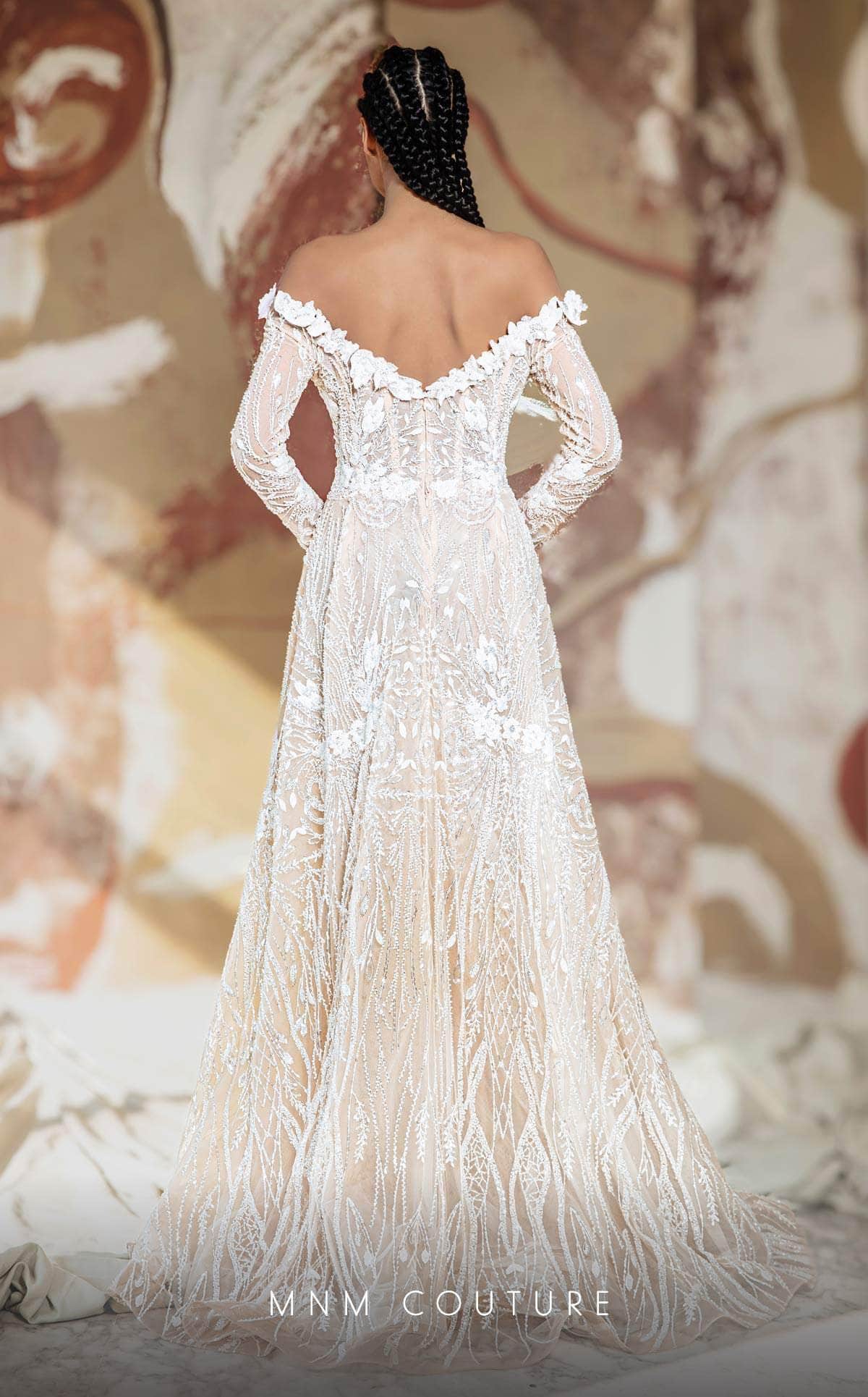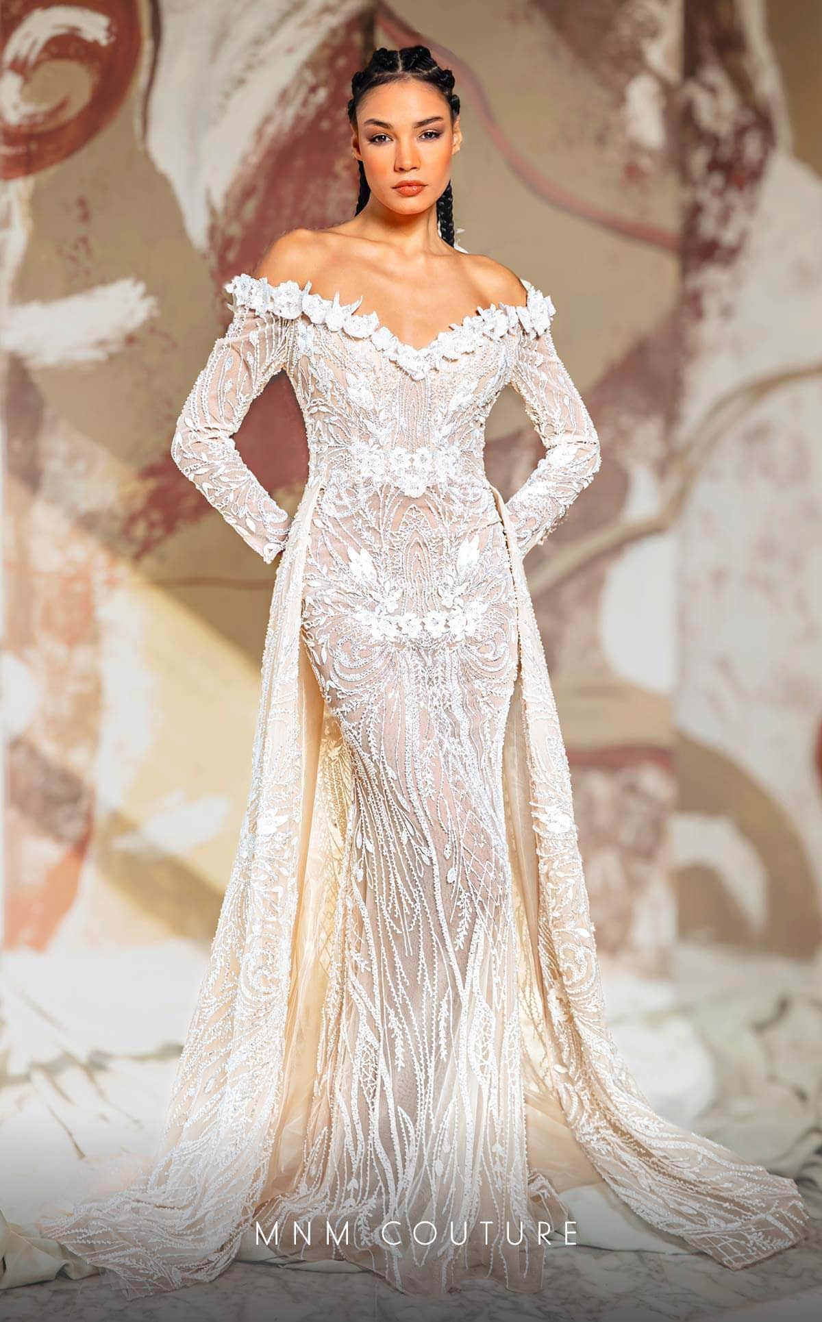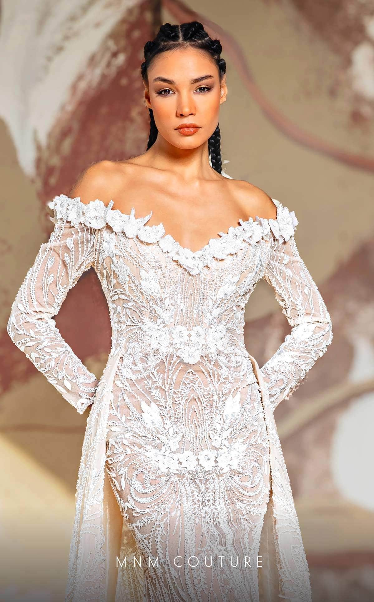 Unlock the allure within you with this MNM Couture K4168 masterpiece. Featuring 3D floral applique, beaded and embroidery embellishment, this gown is sure to make a statement. The upper bodice reveals an off-shoulder v-neckline that highlights your collarbone, while the long sleeves provide just the right amount of coverage. The midrise V-shaped back displays a concealed zipper closure for a seamless fit. The skirt forms a sheath silhouette that drapes appealingly to the full length hem. Complete with the A-line overskirt with a horsehair hem and sweep train that exudes opulence. Make a grand entrance in this MNM Couture K4168 creation. Model is wearing White color.