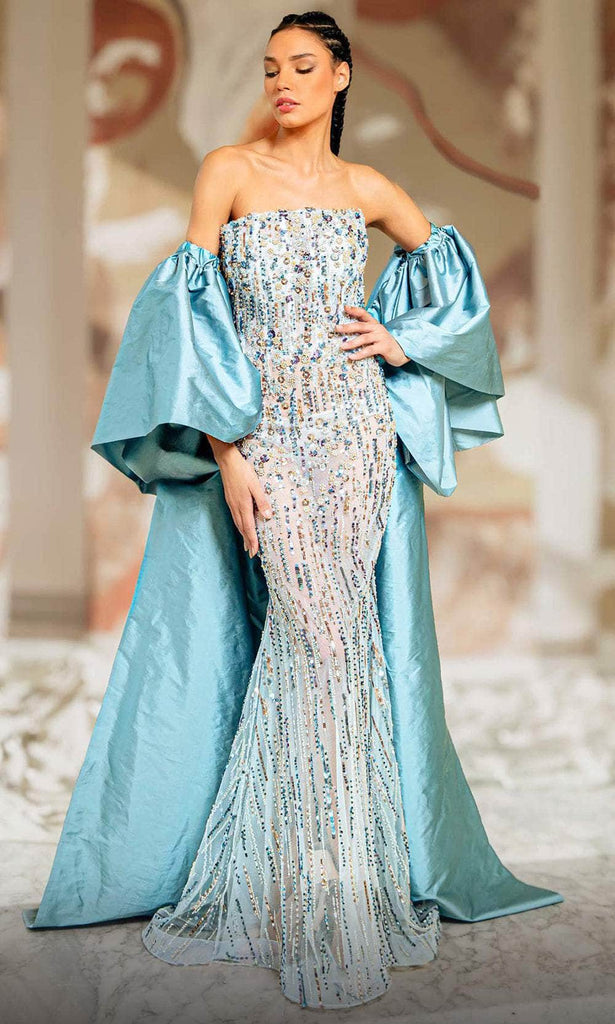 | Details: | Strapless, Multi-Colored Beaded, Sequin, Mid-Open Back, Detachable Long Cape, Fitted, See-Through Bodice |