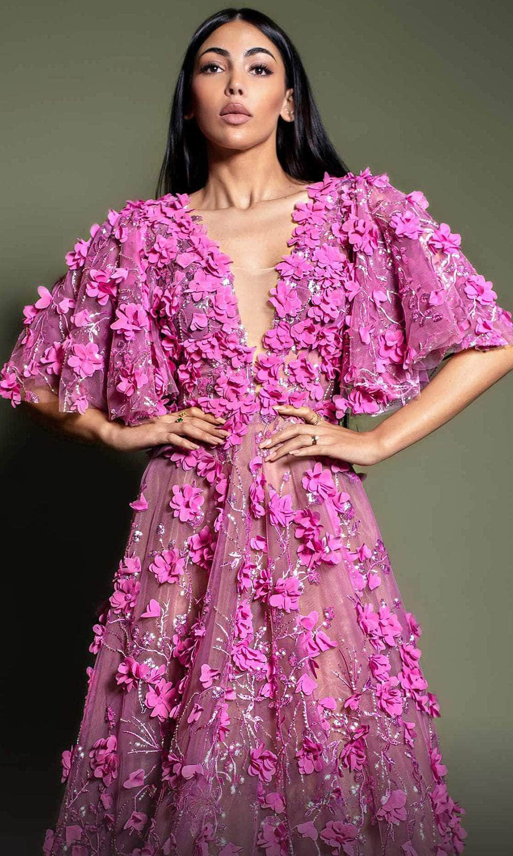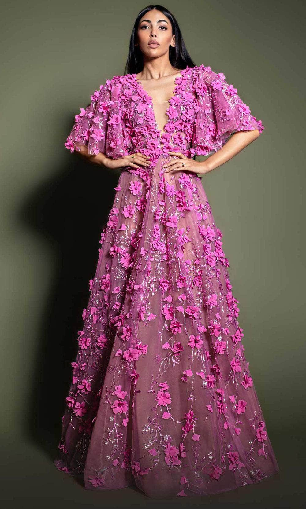 Step into the spotlight with the MNM Couture K4198, an evening gown that embodies elegance and allure. This meticulously tailored masterpiece features a sheer overlay cascading over a lined silhouette, adorned with delicate floral appliques and shimmering beadwork that dance in the light. A plunging V-neckline adds a touch of drama, softened by an illusion modesty inset for a touch of sophisticated charm. Flutter sleeves add a whimsical touch, while the beaded applique A-line skirt flows gracefully into a dramatic sweep train, ensuring you leave a lasting impression wherever you go. With the MNM Couture K4198 creation, you'll be the epitome of red-carpet ready refinement. Model is wearing the Fuchsia color.
