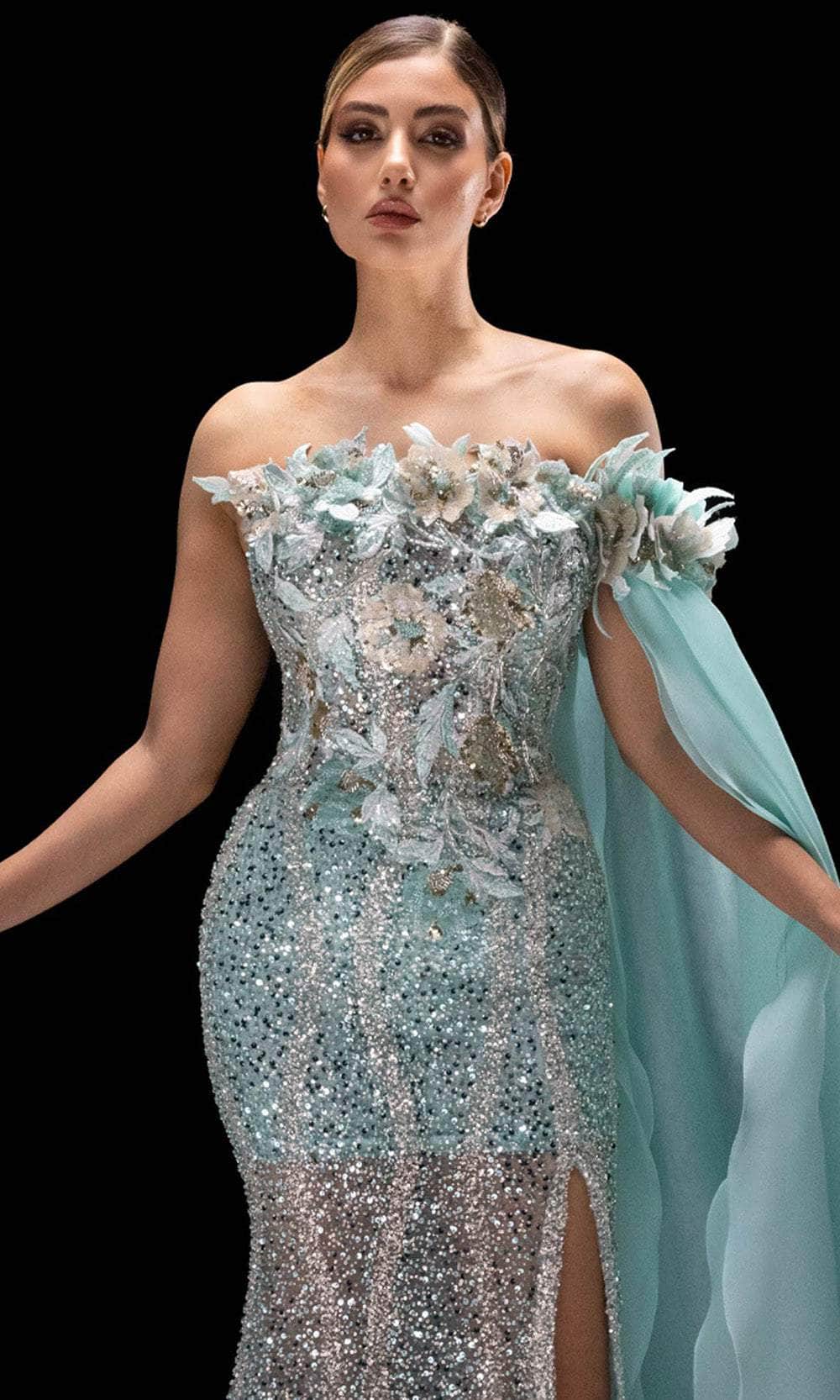 Indulge in the fantasy of haute couture with MNM Couture K4221, a gown that delivers a vision of elegance and artistry. Delicate 3D floral applique with shimmering sequins and beadwork create an opulent yet whimsical design that graces the off shoulder bodice. The form-fitting sheath silhouette is elevated by a thigh-high slit and a graceful one shoulder cape sleeve, offering drama and movement. Step into any luxury occasion with the magnetic charm of MNM Couture K4221, a showpiece worthy of the most exclusive events. Model is wearing Aqua color.