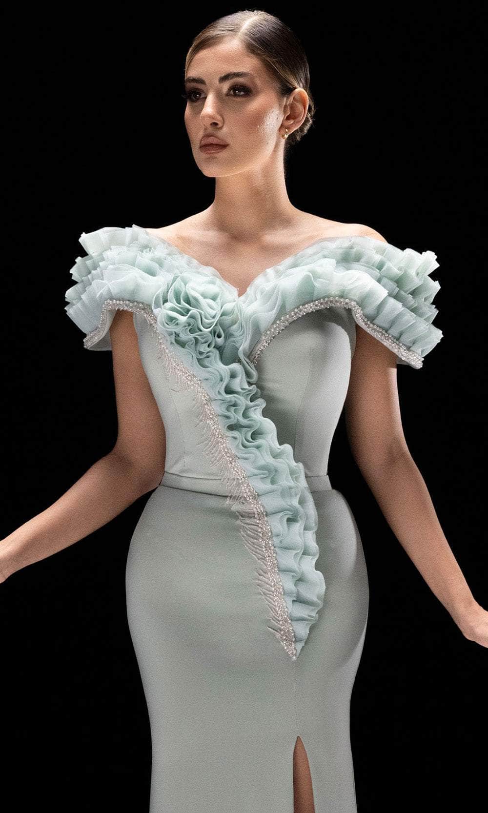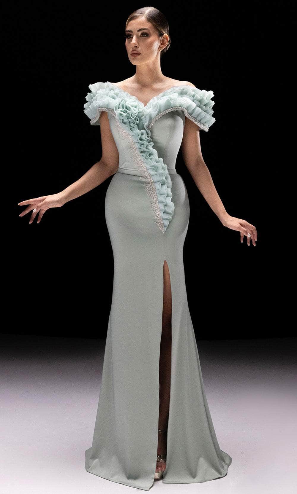 Bring sculptural elegance to life with MNM Couture K4228, a gown designed to mesmerize. The off shoulder sweetheart neckline and short sleeves features intricate ruffles that cascade diagonally along the bodice, drawing the eye with fluid motion. The sleek sheath silhouette flatters every curve, while a daring front slit enhances the gown with a contemporary edge. Pearl and bead detailing infuses the look with a graceful hint of sparkle. Minimal yet impactful, this ensemble is a work of modern couture perfect for high-profile events. Step into timeless sophistication and showstopping grace with MNM Couture K4228. Model is wearing Aqua color.