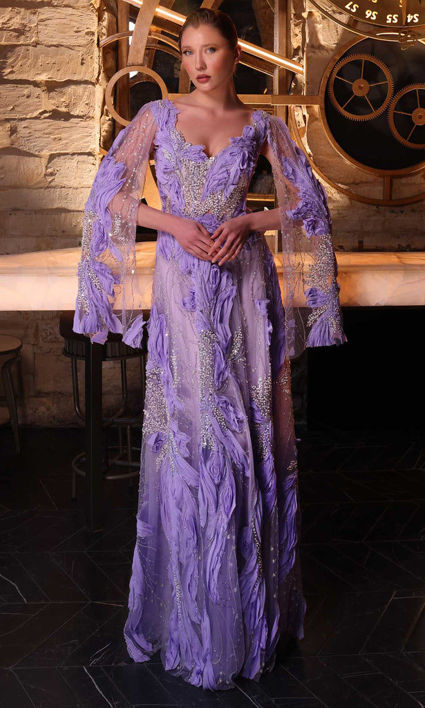 Step into the spotlight with the MNM Couture K4262, a gown that celebrates drama and intricate craftsmanship. The deep V-neckline accentuates the decolletage beautifully, while sheer long sleeves with split design add a whimsical and ethereal touch. The gown elaborate beaded and sequin detailing sparkles under the light, tracing the fit and flare silhouette with artistry and precision. Perfect for upscale soirees or red-carpet occasions, the MNM Couture K4262 is a celebration of individuality and glamour, crafted to make you the center of attention wherever you go. Model is wearing Purple color.