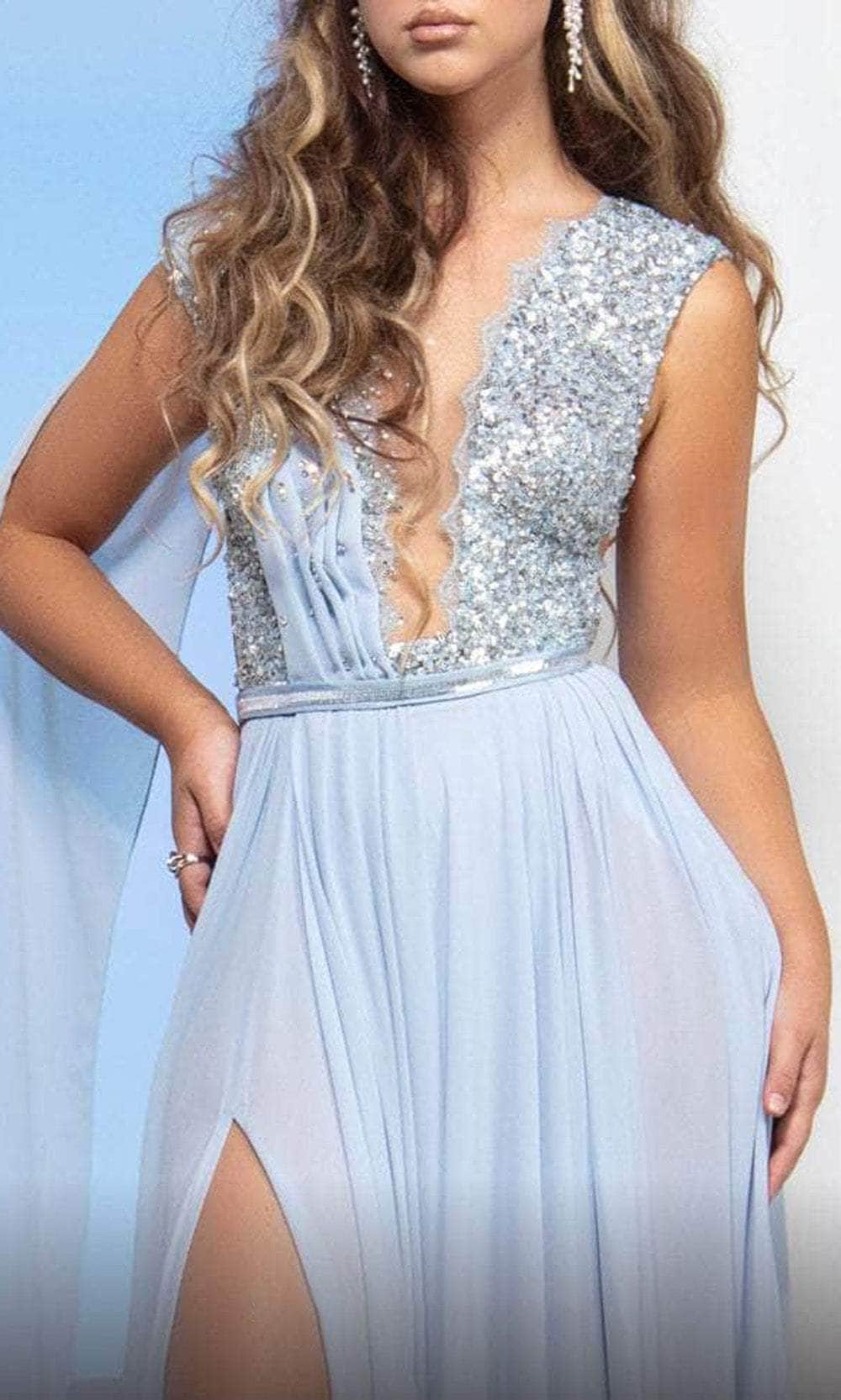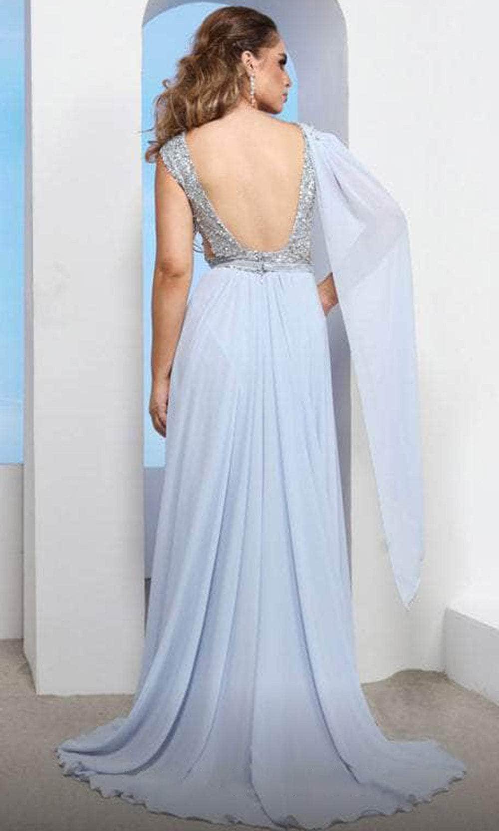 Go beyond beauty in a galactic cocktail dress from MNM Couture M0085. This gorgeous Chiffon gown features an elegant cape and two high side slits in the skirt, bringing back the elegance of the feminine fashion once more. Featuring a metallic rhinestone embellishment on the bodice, the stunning deep V-neck bodice is totally beaded on one side and has a combination of beading and drapes on the other. The cape is long and elegant, and it hangs from drapes at the back of the bodice as the chiffon skirt flourishes to a sweeping train with a thigh high leg slit to show off your legs. This MNM Couture creation is sure to make you the darling of the party! Model is wearing Silver color.