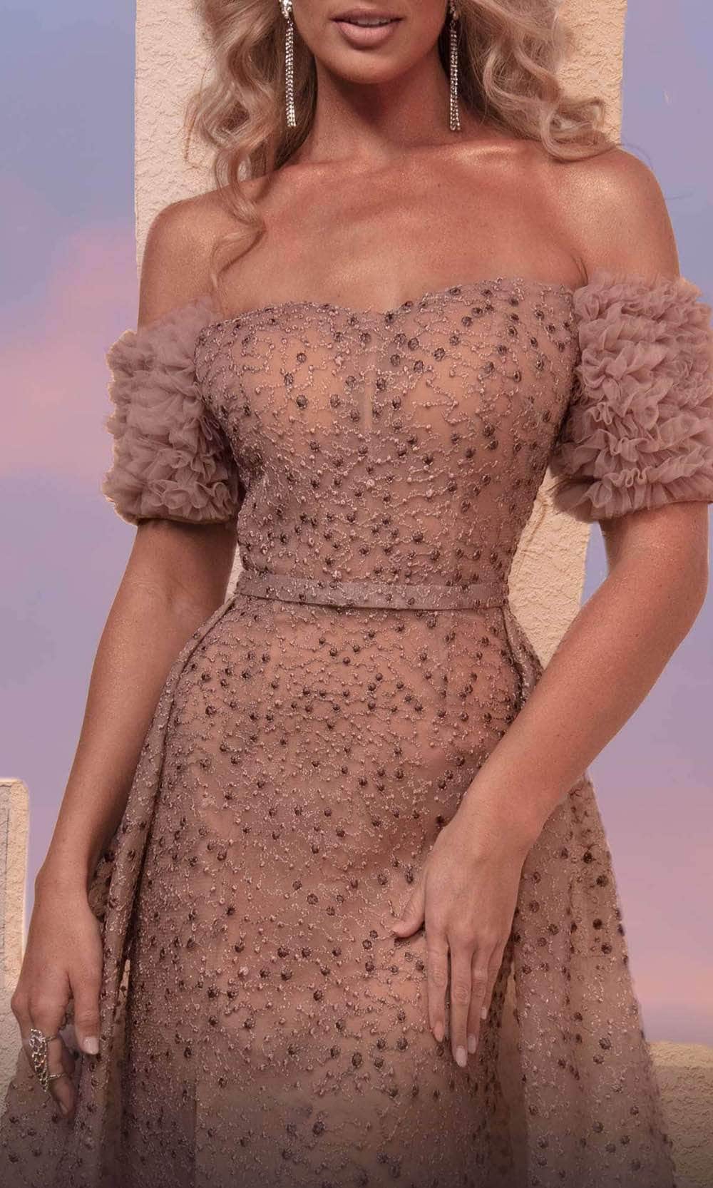 Let your fashion choices reflect your stylish flair and impeccable taste with this MNM Couture M0100 creation. Riddled with beaded embellishments allover its length, this gown features a structured off shoulder bodice with shirr-ornate straps wrapping the arms. A thin ban wraps the natural waist. A high slit charms the mermaid skirt as a grandiose overskirt drapes into a trailing train. Be the ethereal vision to covet for in this MNM Couture masterpiece. Model is wearing the Beige color.