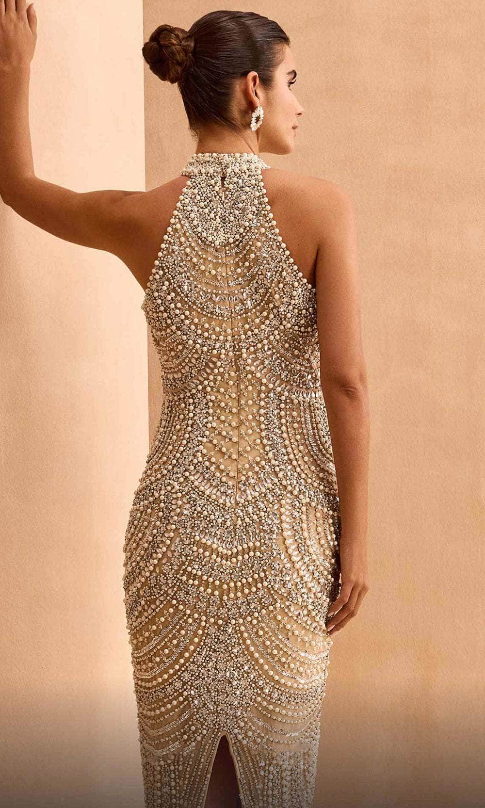 Embrace timeless elegance with the MNM Couture M1143L evening gown. Expert tailoring sculpts a captivating silhouette, accentuated by the clean lines of the sleeveless design. A mesmerizing array of multi-beadwork adorns the dress, catching the light with every move. The high halter neckline offers a touch of sophisticated structure, complemented by a sculpted sweetheart lining that flatters your figure. The racerback ensures comfort and a touch of modern edge, while a concealed zipper closure creates a smooth, polished look. The sheath skirt flows gracefully to the full-length hem, adding a touch of classic minimalism. This MNM Couture M1143L masterpiece is the perfect blend of intricate detail and timeless design at any formal event. Model is wearing the Ivory color.