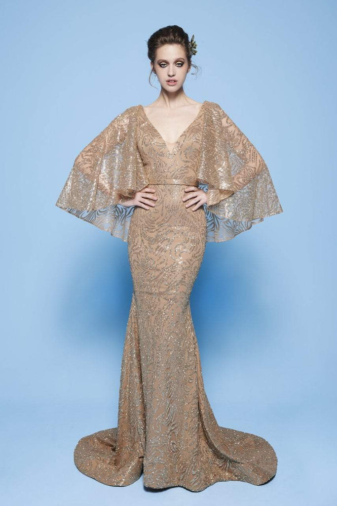 Paint a picture of pure sophistication as you channel your inner celebrity style with MNM Couture N0245 evening dress. The gown is elegantly designed with burst of glittering sequins all over the mermaid silhouette, framed with fitted bodice and V neckline. Features gorgeous sequin-embellished sheer cape sleeves. Form fitting through the hips, the skirt boasts a striking flare at the back finishing into a sweep train. Sparkle with utmost elegance as you radiate a regal style and new height of fashion in this MNM Couture gown. Model is wearing the Gold color.