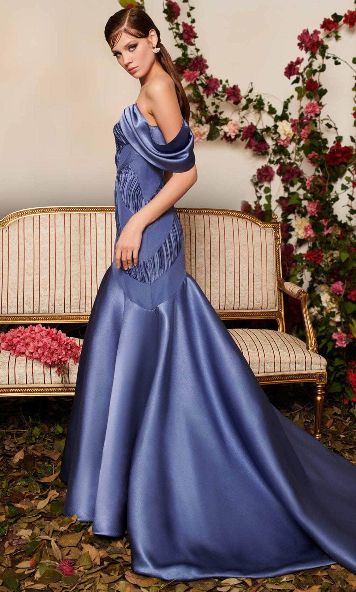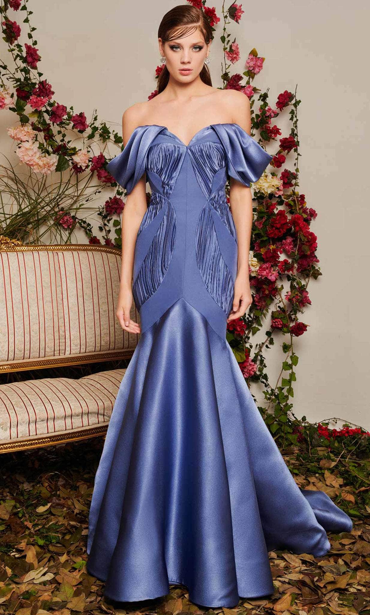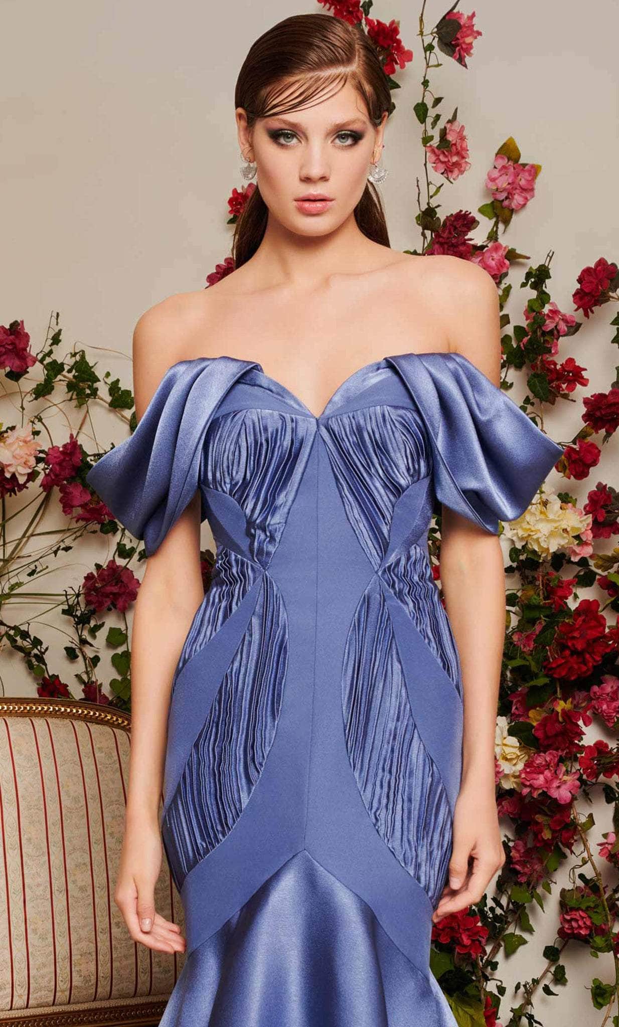 This enchanting MNM Couture N0493 is sure to make you the center of everyones attention. This gown uses combination of satin and crepe fabric to show the artistic creativity of this masterpiece. Fall off sleeves adds drama with and is pairing perfectly with the sweetheart neckline. Has ruching details to complement the contoured shape of the wearer. This gown finishes with a long chapel train for a dramatic walk in the aisle experience. MNM Couture N0493 is a stunning look for your evening occasion. Model is wearing Purple color.