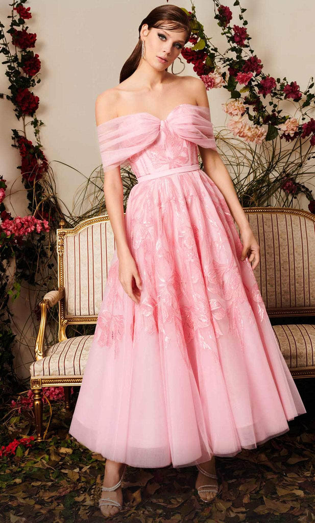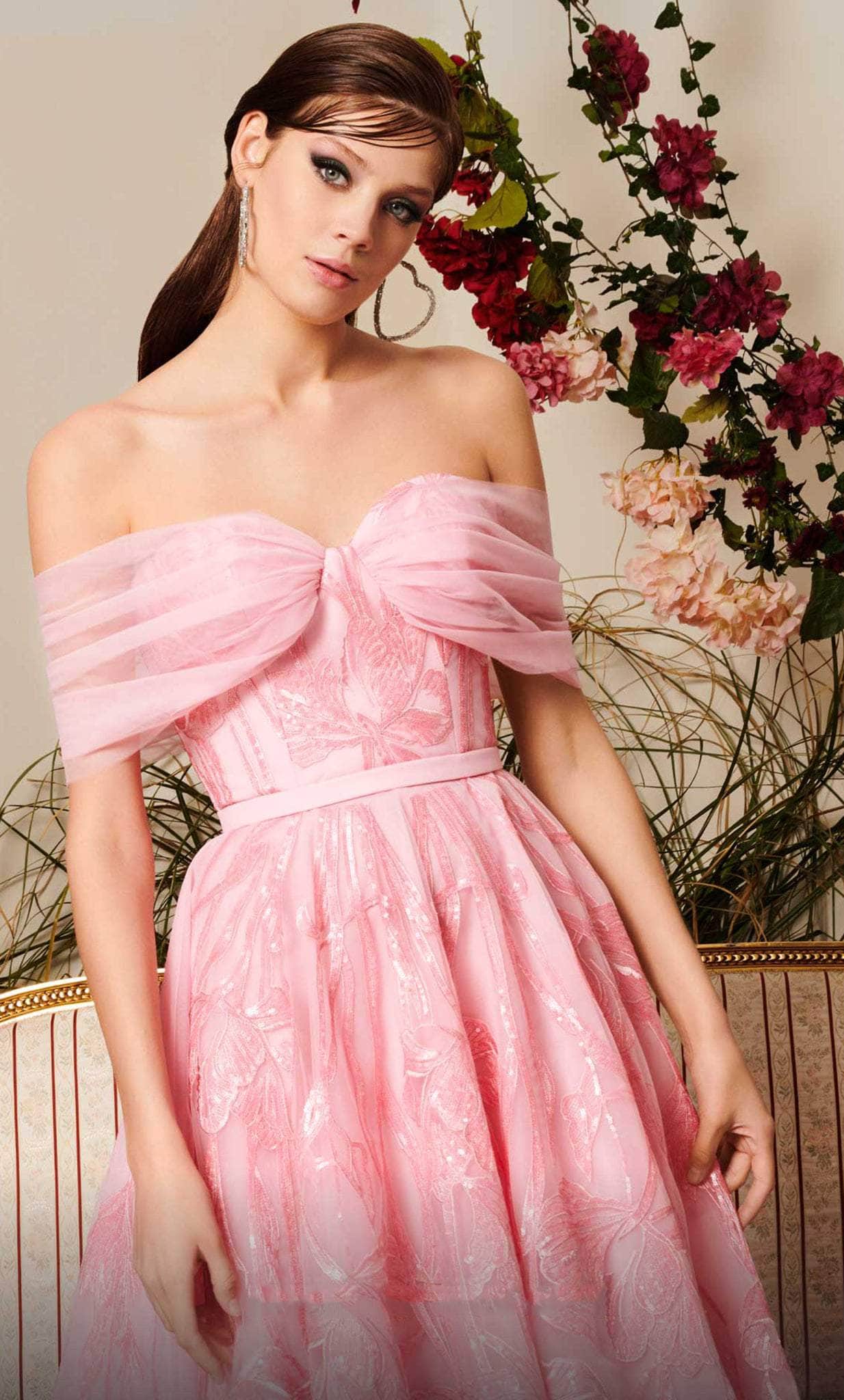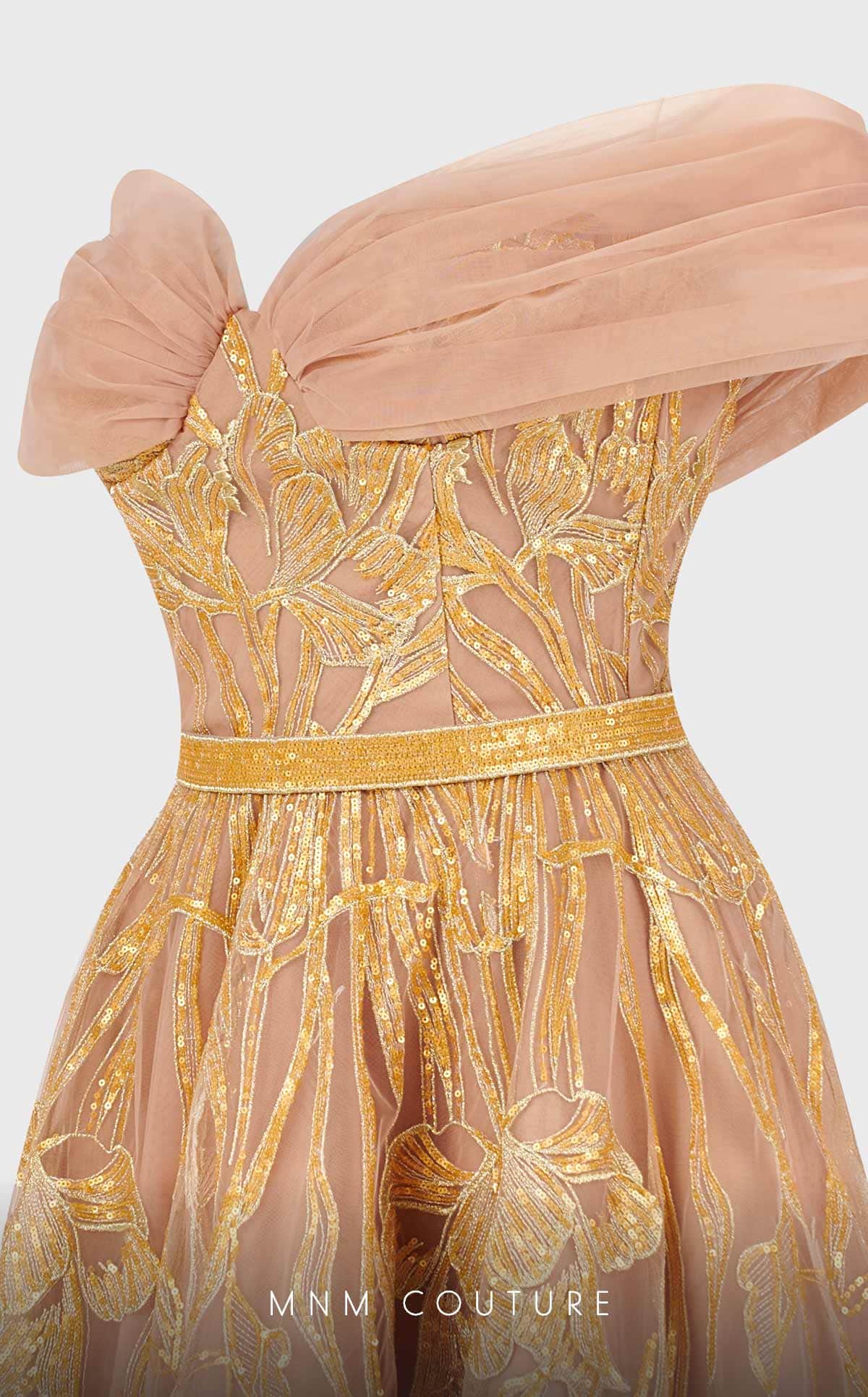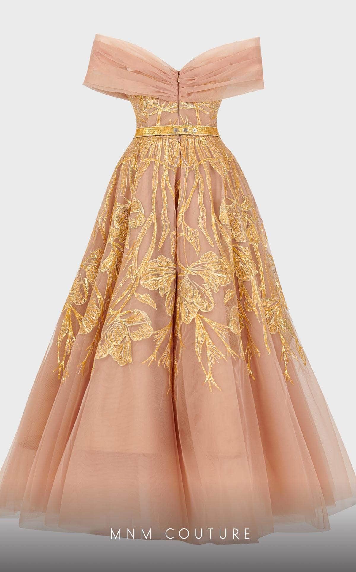Walk into the ballroom and resonate a sophisticated style in this fabulous MNM Couture N0498 creation. Wrapped with a shirr paneled off shoulder draping, this dress parades a bustier style bodice with a sweetheart design. Gleaming with an intricate tonal sequined motif allover its length, this ensemble flourishes a slim band wrapping the waist and a midrise back. Showcasing a voluminous design, the A-line skirt cascades into a tea length hemline. Be at the front and center of the limelight in this chic MNM Couture masterpiece. Dress is pictured in Pink, Blue, and Olive colors.