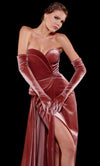 Astound everyone with the magnificent allure of this MNM Couture N0515 creation. Style with tailoring lines on a luxurious velvet silhouette, this stunner features a strapless sweetheart neckline with petal like peplum accents. Designed with a nipped inset band and a midrise back, a dramatic spill of cascading sash complements the high slit sheath skirt. Standout among the fabulous crowd as all eyes focus on you in this MNM COUTURE masterpiece. Model is wearing the Pink color.