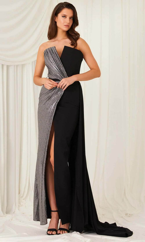 Capture the glamour as you walk on this elegant creation from MNM Couture N0532A. With its stylish two-toned and faux wrap bodice, this strapless gown guarantees to make heads turn. It comes with a v-neckline for an appealing look, complemented by the straight mid-open zippered back. The thin band defines your waist to further enhance your feminine allure. The skirt glides a full length sheath silhouette and it opens a front high leg slit to beautifully showcase your confidence. A side draping sash adds a luxurious and dramatic touch. In this MNM Couture N0532A evening gown, you will captivate the room and make a lasting impression. Model is wearing the Black And Silver color.