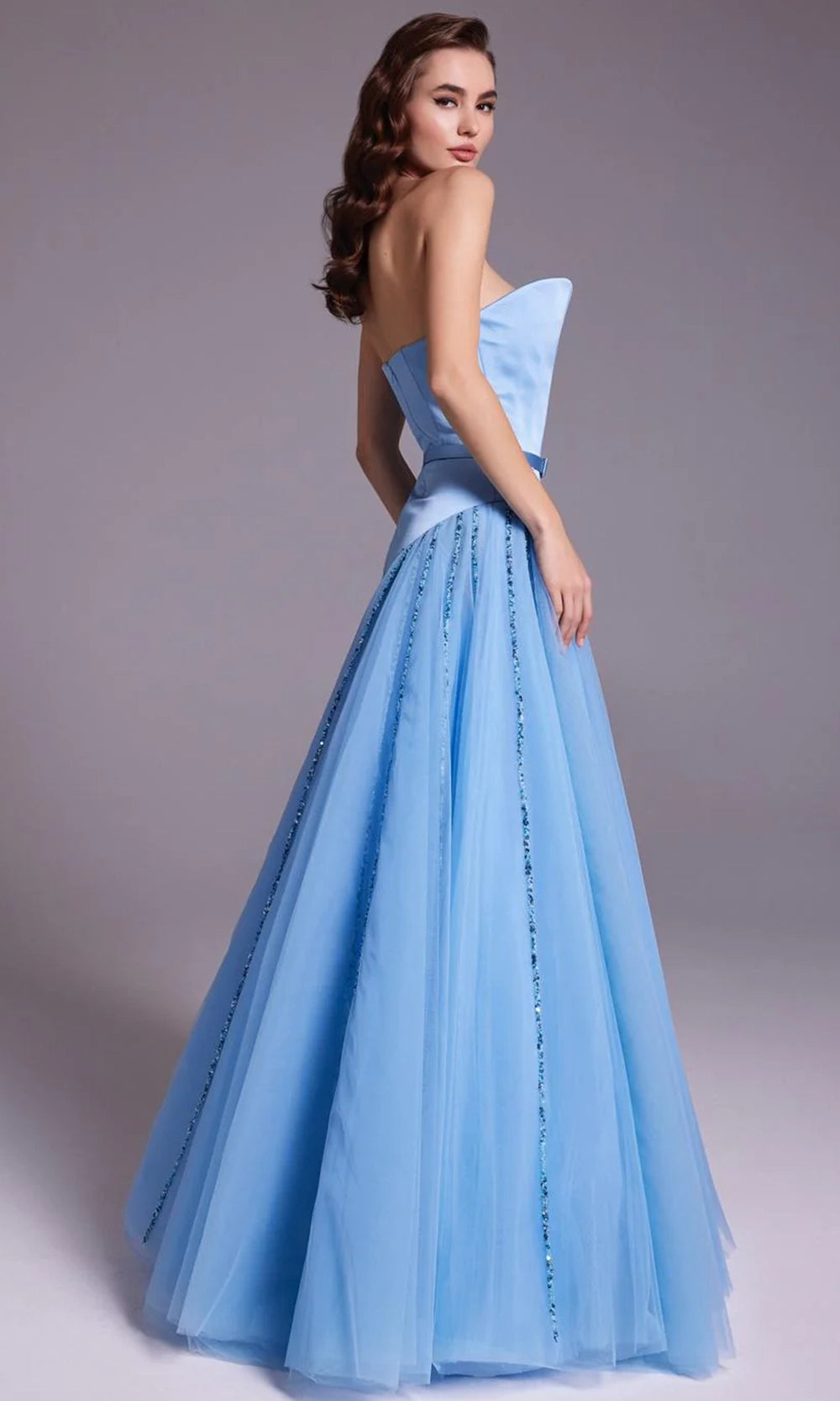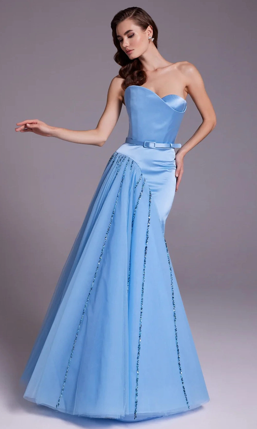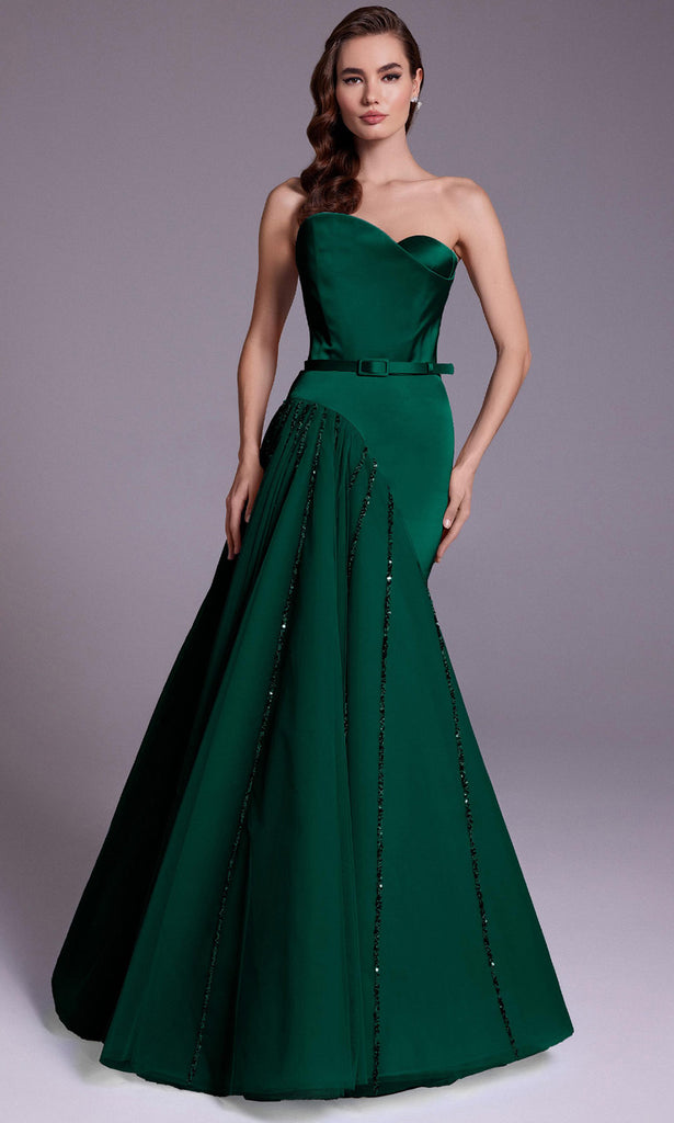 Prepare to dazzle in MNM Couture N0536, a stunning strapless gown that fuses classic charm with modern flair. The bodice fits like a dream, while the organza A-line skirt is adorned with linear beaded and sequined accents that shimmer with every step. A buckled belt and asymmetric sweetheart neckline bring the design to a stylish finish. Ideal for galas, black-tie events, or red carpet moments, MNM Couture N0536 ensures you command attention from all angles. Models are wearing Green, and Ice Blue colors.