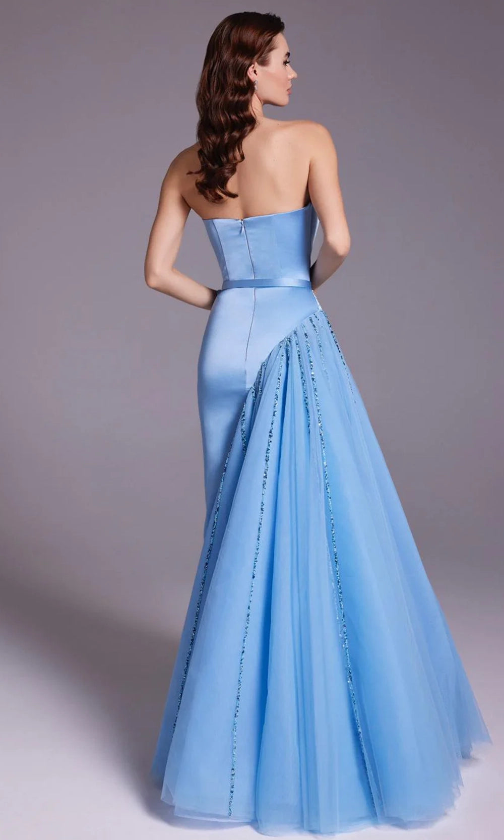 | Details: | Strapless, Beaded And Sequined Accents, Asymmetrical Draping, Thigh-High Slit, Belt |