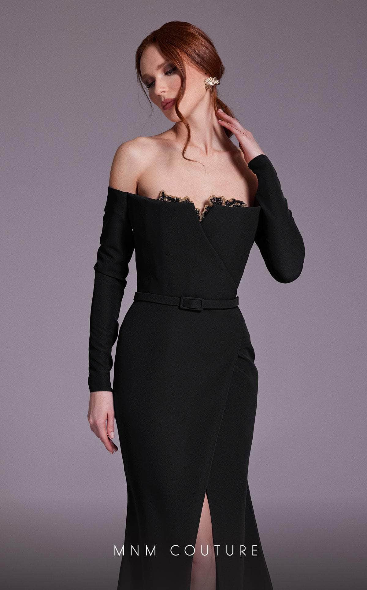 Discover refinement, sophistication and true luxury with MNM Couture N0541. Crafted from a luxuriously soft solid tone crepe fabric, this exquisite evening gown features an off-shoulder design with long, slender sleeves and an embroidered piece peaking from the bust. The dress is complemented with a tonal thin belt, creating an elegant contour. For an athletic gracefulness, the soft mermaid silhouette is finished with a subtle slit. MNM Couture N0541 is the ultimate expression in modern-day elegance.