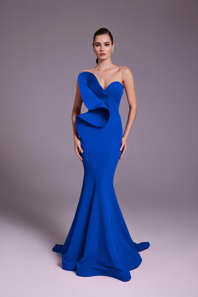 Make a statement in the show-stopping MNM Couture N0548! This daring gown is crafted from figure-flattering crepe fabric that gives you an unbeatable silhouette. The strapless sweetheart neckline with structured drape accent on the fitted bodice accentuates your curves in all the right places. A tonal waist band and subtle train adds the perfect finishing touches. Get ready to take the night by storm in the MNM Couture N0548! Take a risk and choose this daring gown for your next special occasion. Dare to be remarkable! Models are wearing the Blue, Fuchsia, and Green colors.