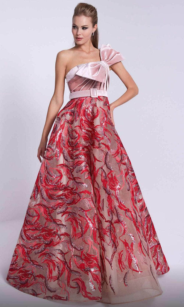 Charm everyone in sight in this MNM Couture N0576 creation. The sleeveless gown exhibits a one-shoulder wide strap, as well as the pleated and beautiful bow detail on top for an effortlessly elegant look. A buckled belt emphasizes the natural waist for a flattering fit. Show off a hint of your skin with the mid-open design in the back. Carved in a glittering A-line silhouette, the full-length skirt is embellished with luxurious sequins and embroidery. This MNM Couture N0576 gown is an exceptional and stylish addition to any wardrobe.
