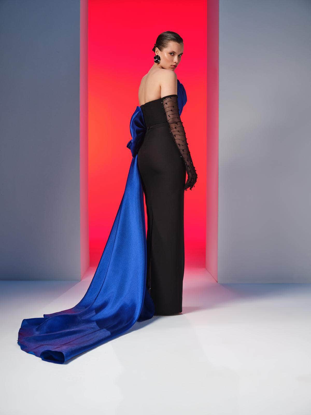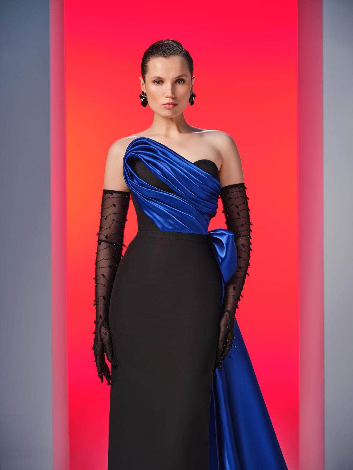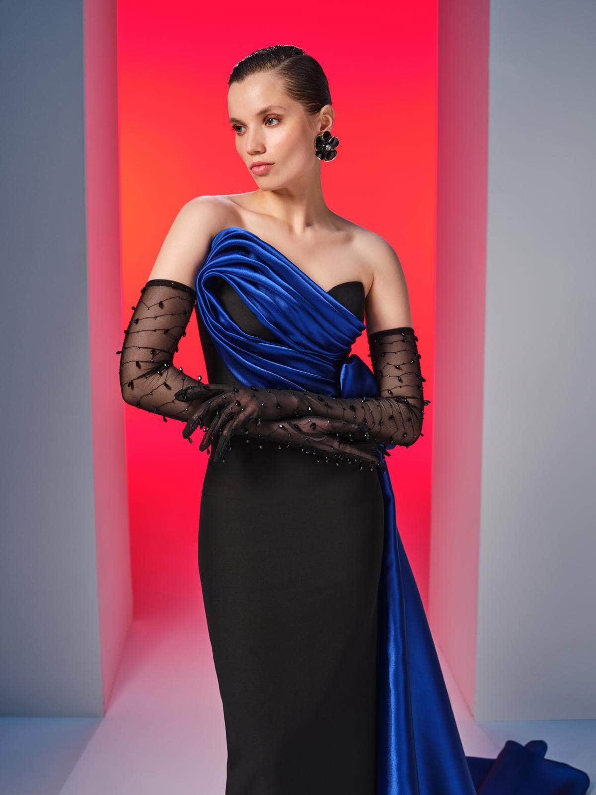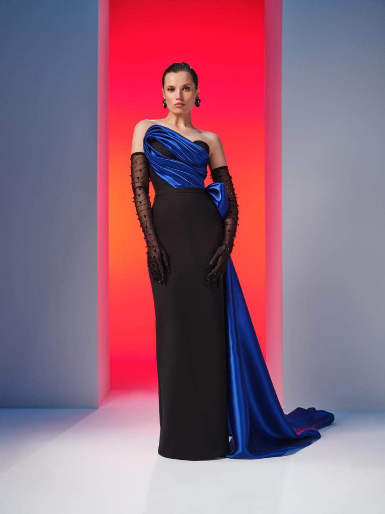 Create a statement that is truly unforgettable in this MNM Couture N0610 masterpiece. Showcasing a sculpted bodice with ruching and a strapless asymmetric neckline, the gown exudes a luxurious and glamorous aesthetic. The straight midrise back has a hidden zipper closure for a cozy fit, while the sheer gloves with beaded adornment offer an extra appeal. From the natural waist, it unveils a captivating side draped with a bow accent. The column skirt that tapers to the full length and a high leg slit in the back finishes this ensemble. Strike an elegant pose by wearing the MNM Couture N0610 long gown. Model is wearing Black/Royal color.