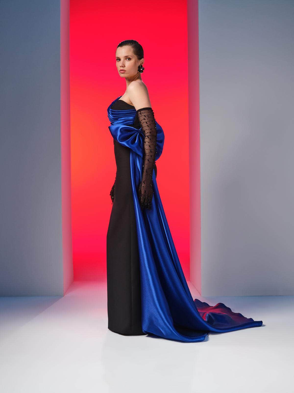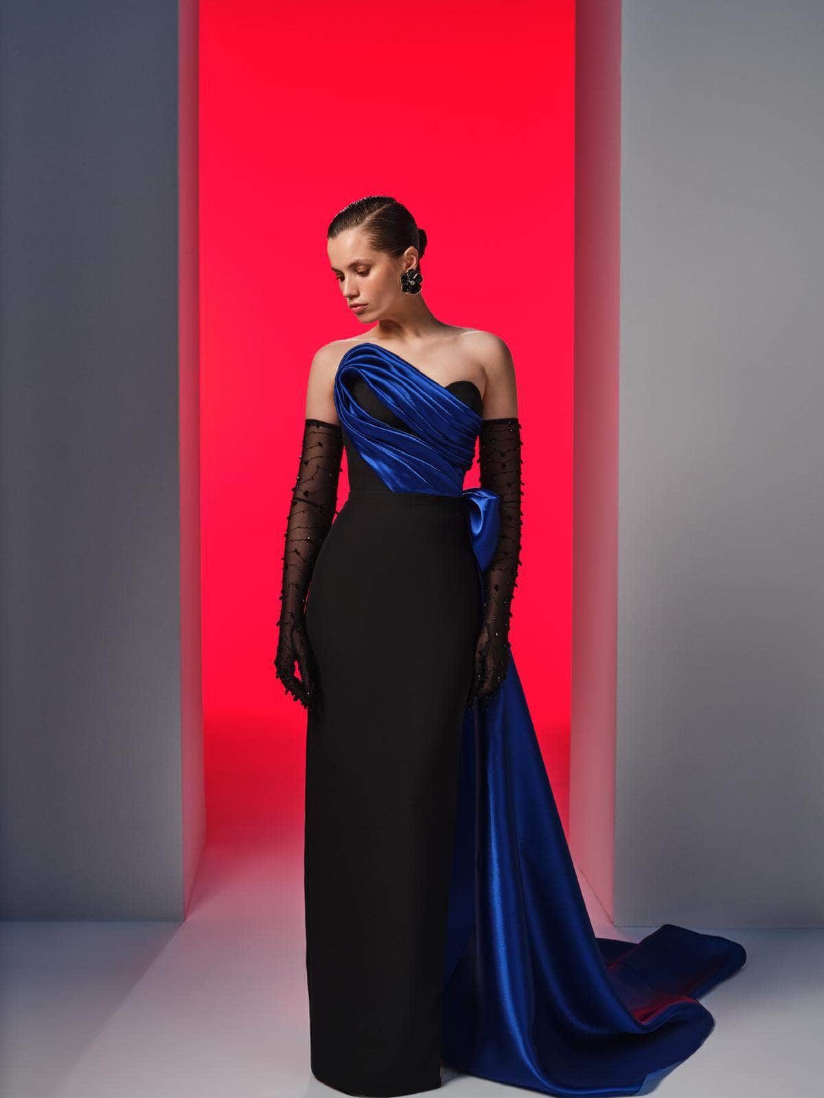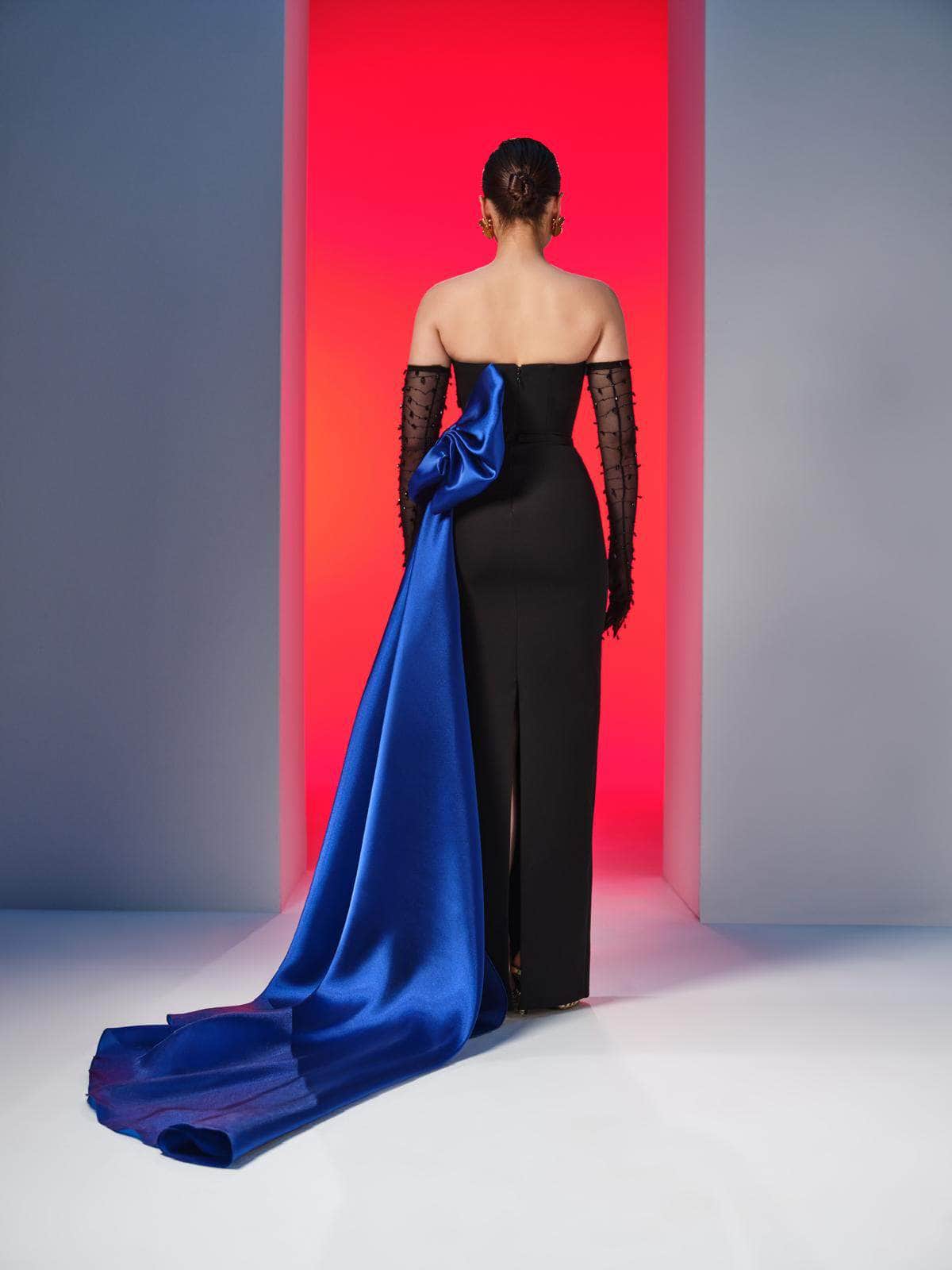 Create a statement that is truly unforgettable in this MNM Couture N0610 masterpiece. Showcasing a sculpted bodice with ruching and a strapless asymmetric neckline, the gown exudes a luxurious and glamorous aesthetic. The straight midrise back has a hidden zipper closure for a cozy fit, while the sheer gloves with beaded adornment offer an extra appeal. From the natural waist, it unveils a captivating side draped with a bow accent. The column skirt that tapers to the full length and a high leg slit in the back finishes this ensemble. Strike an elegant pose by wearing the MNM Couture N0610 long gown. Model is wearing Black/Royal color.