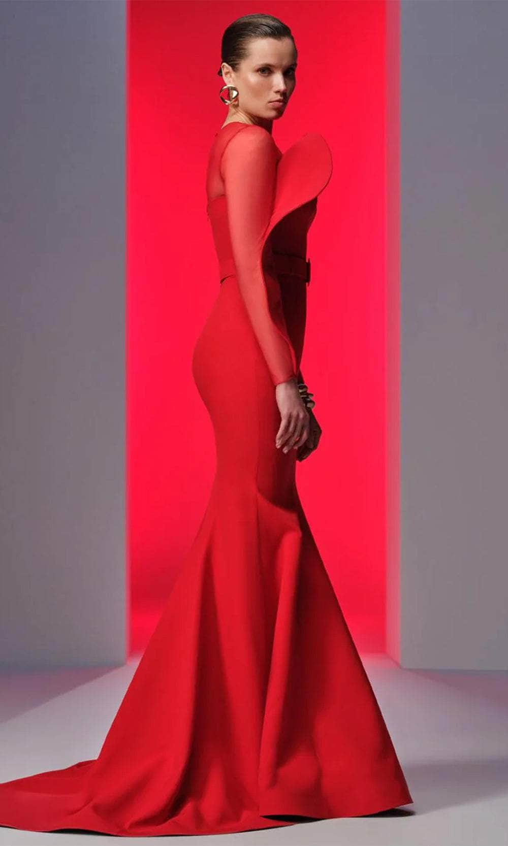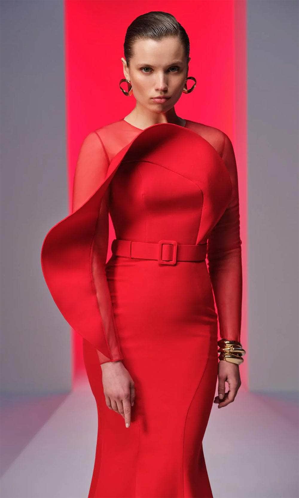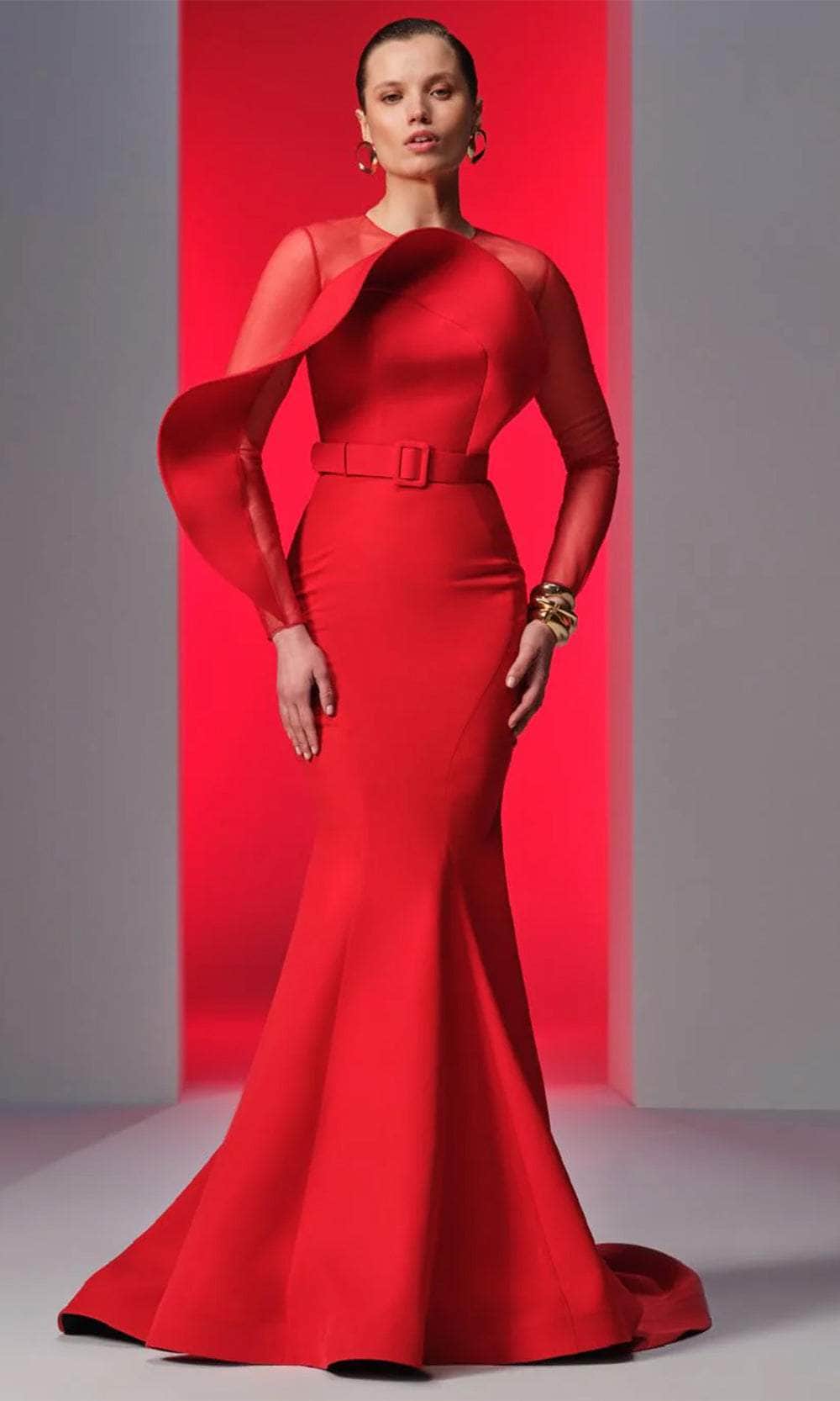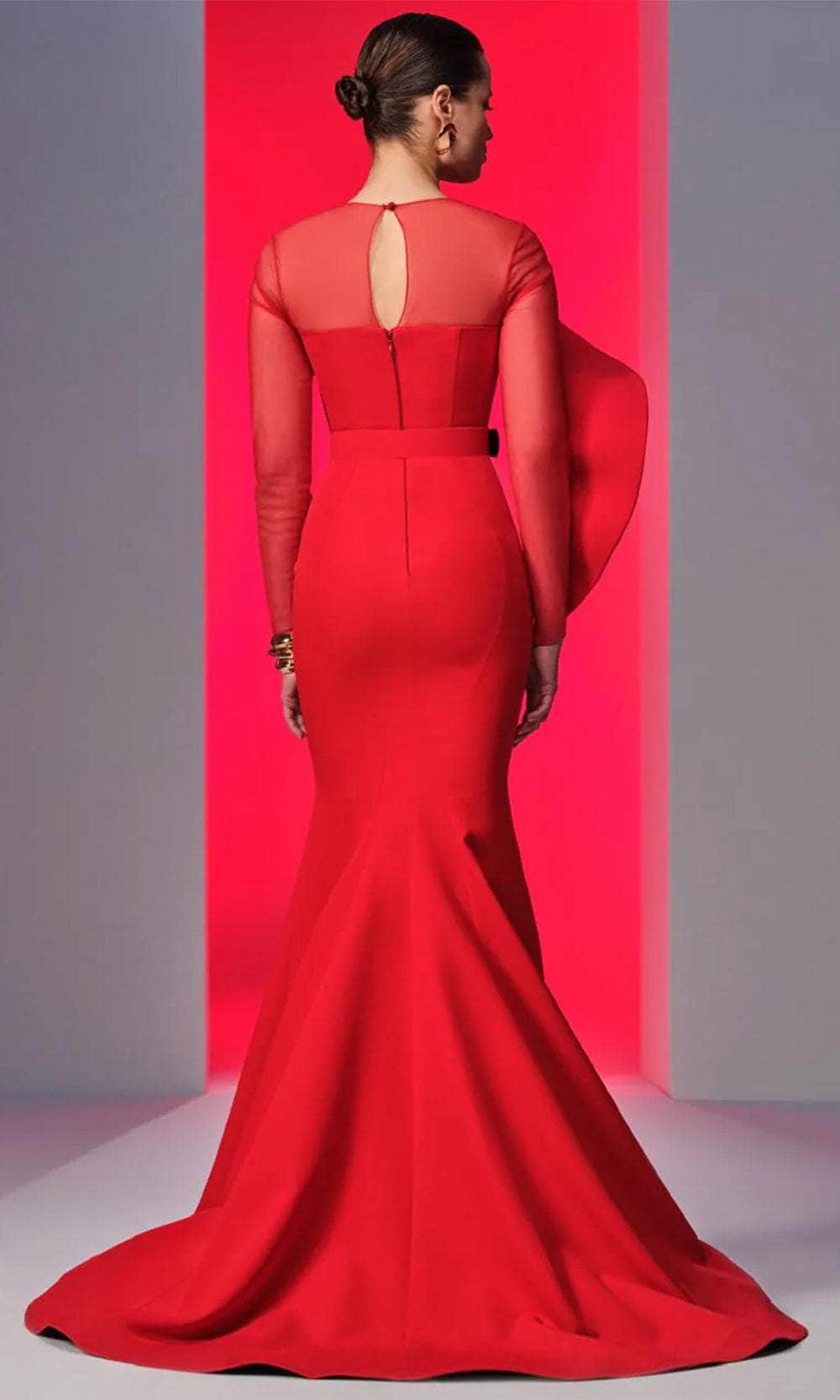 Experience the opulent elegance of this MNM Couture N0613 masterpiece. Made from crepe fabric, the gown features a show-stopping illusion bodice topped by a jewel neckline and long sleeves. The buckled belt defines the waist for a slim appearance, while the keyhole full back adds a dash of allure. For an extra wow effect, it includes a structure-draped design on the bust and sleeve. The skirt creates a luxurious mermaid silhouette that smoothly flares into a sweeping train and fits comfortably in the hips. Make it your evening worth reminiscing in this MNM Couture N0613 gown. Model is wearing Red color.