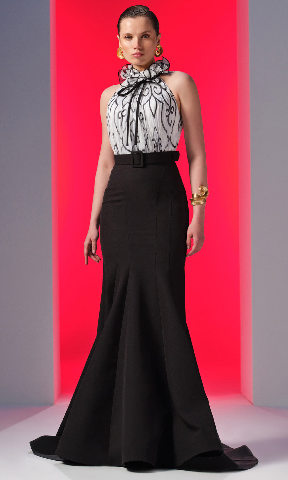 Dare to impress in the MNM Couture N0615 unforgettable gown, designed for the fashion-forward woman. A stunning high halter neckline with flower-shaped drapes and thin bow frames the shoulders beautifully, while the belted waist creates a flattering, defined silhouette. The abstract print adds a contemporary twist, and the crepe mermaid skirt flows with striking elegance. For any gala or upscale celebration, the MNM Couture N0615 guarantees you will command attention and leave an impression of bold sophistication. Model is wearing Black/White color.